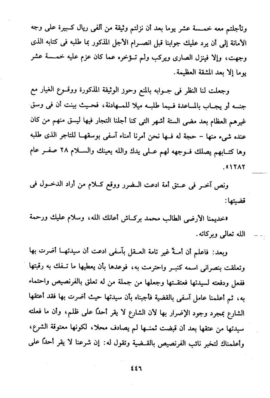 وبعد: فاعلم أن أمةً غير تامة العقل بآسفى ادعت أن سيدتها أضرت بها وتعلقت بنصرانى اسمه كنبر واحترمت به، فوعدها بأن يعطيها ما تفك به رقبتها ففعل ودفعته لسيدتها فعتقتها وجعلها من جملة من له تعلق بالفرنصيص واحتماء به، ثم أعلمنا عامل آسفى بالقضية فأجبناه بأن سيدتها حيث أضرت بها فقد أعتقها الشارع بمجرد وجود الإضرار بها لأن الشارع لا يقر أحداً على ظلم، وأن ما فعلته سيدتها من عتقها بعد أن قبضت ثمنها لم يصادف محلا، لكونها معتوقة الشرع، وأعلمناك لتخبر نائب الفرنصيص بالقضية وتقول له: إن شرعنا لا يقر أحداً على