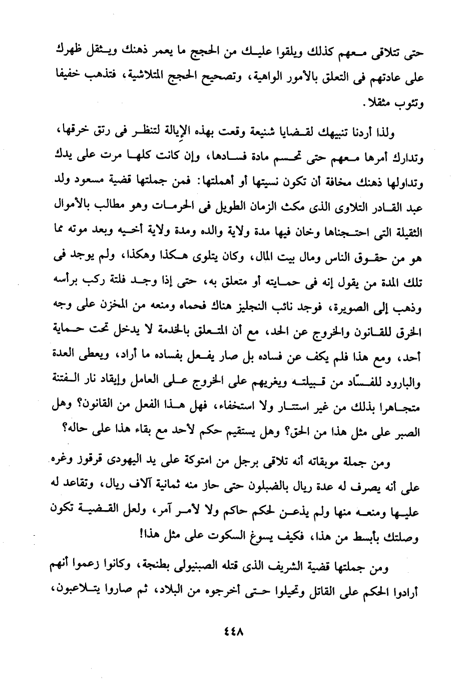 ولذا أردنا تنبيهك لقضايا شنيعة وقعت بهذه الإِيالة لتنظر في رتق خرقها، وتدارك أمرها معهم حتى تحسم مادة فسادها، وإن كانت كلها مرت على يدك وتداولها ذهنك مخافة أن تكون نسيتها أو أهملتها: فمن جملتها قضية مسعود ولد عبد القادر التلاوى الذى مكث الزمان الطويل في الحرمات وهو مطالب بالأموال الثقيلة التي احتجناها وخان فيها مدة ولاية والده ومدة ولاية أخيه وبعد موته مما هو من حقوق الناس ومال بيت المال، وكان يتلوى هكذا وهكذا، ولم يوجد في تلك المدة من يقول إنه في حمايته أو متعلق به، حتى إذا وجد فلتة ركب برأسه وذهب إلى الصويرة، فوجد نائب النجليز هناك فحماه ومنعه من المخزن على وجه الخرق للقانون والخروج عن الحد، مع أن المتعلق بالخدمة لا يدخل تحت حماية أحد، ومع هذا فلم يكف عن فساده بل صار يفعل بفساده ما أراد، ويعطى العدة والبارود للفسّاد من قبيلته ويغريهم على الخروج على العامل وإيقاد نار الفتنة متجاهرا بذلك من غير استتار ولا استخفاء، فهل هذا الفعل من القانون؟ وهل الصبر على مثل هذا من الحق؟ وهل يستقيم حكم لأحد مع بقاء هذا على حاله؟