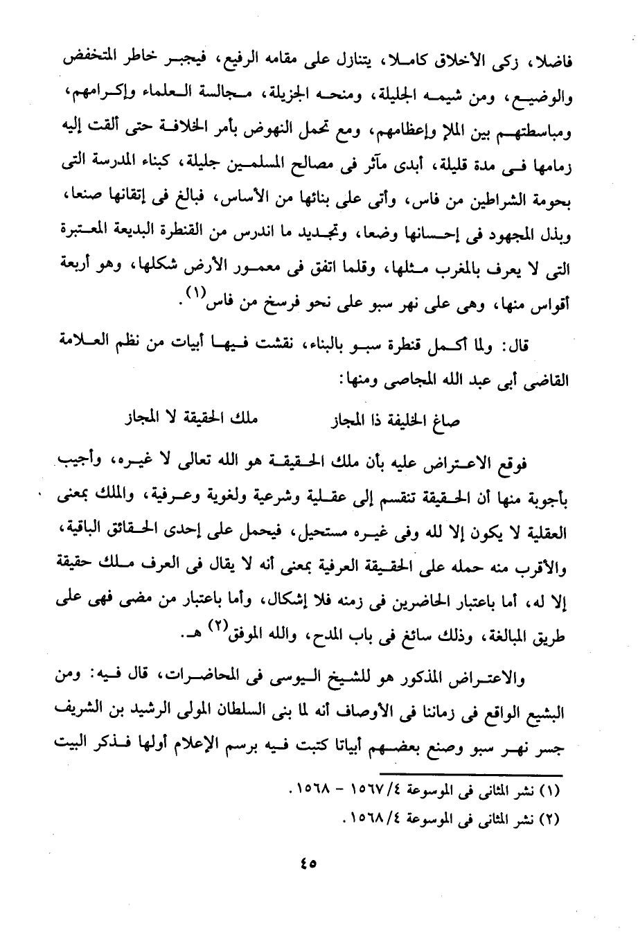 والاعتراض المذكور هو للشيخ اليوسى في المحاضرات، قال فيه: ومن البشيع الواقع في زماننا في الأوصاف أنَّه لما بنى السلطان المولى الرشيد بن الشريف جسر نهر سبو وصنع بعضهم أبياتا كتبت فيه برسم الإعلام أولها فذكر البيت