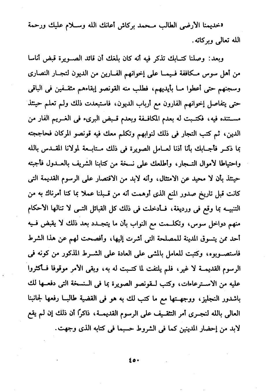 وبعد: وصلنا كتابك تذكر فيه أنه كان بلغك أن قائد الصويرة قبض أناسا من أهل سوس مكاففة فيما على إخوانهم الفارين من الديون لتجار النصارى وسجنهم حتى أعطوا ما بأيديهم، فطلب منه القونصو إبقاءهم مثقفين في الباقى حتى يتفاصل إخوانهم الفارون مع أرباب الديون، فاستبعدت ذلك ولم تعلم حينئذ مستنده فيه، فكتبت له بعدم المكاففة وبعدم قبض البرئ في الغريم الفار من الدين، ثم كتب التجار في ذلك لنوابهم وتكلم معك فيه قونصو المركان فحاججته بما ذكر فأجابك بانا أذنا لعامل الصويرة في ذلك متابعة لمولانا المقدس بالله واحتياطا لأموال التجار، وأطلعك على نسخة من كتابنا الشريف بالعدول فأجبته حينئذ بأن لا محيد عن الامتثال، وأنه لابد من الاقتصار على الرسوم القديمة التي كانت قبل تاريخ صدور المنع الذى أوهمت أنه من قبلنا عملا بما كنا أمرناك به من التنبيه بما وقع في ورديغة، فأدخلت في ذلك كل القبائل التي لا تنالها الأحكام منهم دواخل سوس، وتكلمت مع النواب بأن ما يتجدد بعد ذلك لا يقبض فيه أحد ممن يتسوق المدينة للمصلحة التي أشرت إليها، وأفصحت لهم عن هذا الشرط فاستصوبوه، وكتبت للعامل بالمشى على العادة على الشرط المذكور من كونه في الرسوم القديمة لا غير، فلم يلتفت لما كتبت له به، وبقى الأمر موقوفا فأكثروا عليه من الاسترعاءات، وكتب لقونصو الصويرة بما في النسخة التي دفعها لك باشدور النجليز، ووجهتها مع ما كتب لك به هو في القضية طالبا رفعها لجانبنا العالى بالله لنجرى أمر التثقيف على الرسوم القديمة، ذاكراً أن ذلك إن لم يقع لابد من إحضار المدينين كما في الشروط حسبما في كتابه الذى وجهت.