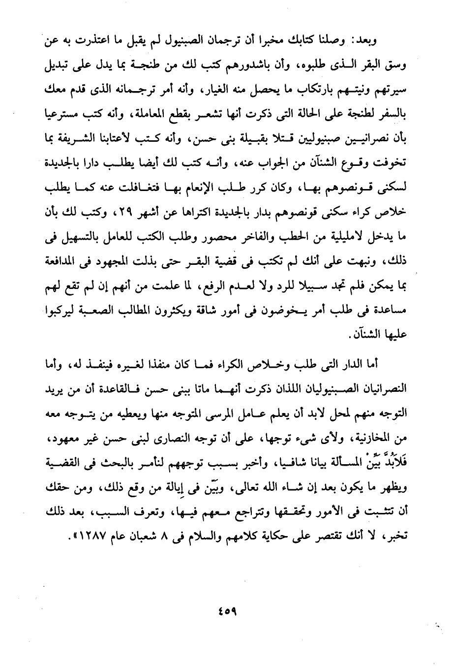 أما الدار التي طلب وخلاص الكراء فما كان منفذا لغيره فينفذ له، وأما النصرانيان الصبنيوليان اللذان ذكرت أنهما ماتا ببنى حسن فالقاعدة أن من يريد التوجه منهم قال لابد أن يعلم عامل المرسى المتوجه منها ويعطيه من يتوجه معه من المخازنية، ولأى شئ توجها، على أن توجه النصارى لبنى حسن غير معهود، فَلاَبُدَّ بمنْ المسألة بيانا شافيا، وأخبر بسبب توجههم لنأمر بالبحث في القضية ويظهر ما يكون بعد إن شاء الله تعالى، وبَيّن في إِيالة من وقع ذلك، ومن حقك أن تتثبت في الأمور وتحققها وتتراجع معهم فيها، وتعرف السبب، بعد ذلك تخبر، لا أنك تقتصر على حكاية كلامهم والسلام في 8 شعبان عام 1287".