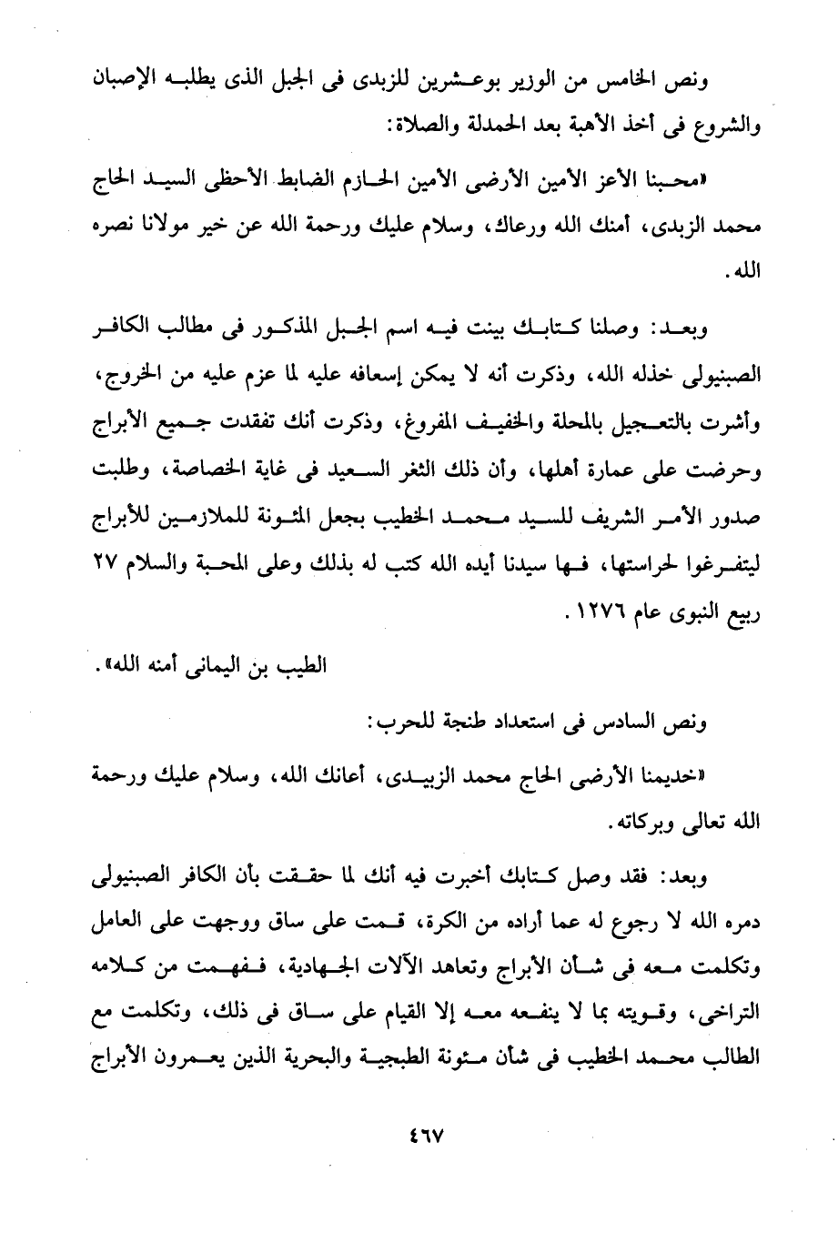 وبعد: وصلنا كتابك بينت فيه اسم الجبل المذكور في مطالب الكافر الصبنيولى خذله الله، وذكرت أنه لا يمكن إسعافه عليه لما عزم عليه من الخروج، وأشرت بالتعجيل بالمحلة والخفيف المفروغ، وذكرت أنك تفقدت جميع الأبراج وحرضت على عمارة أهلها، وأن ذلك الثغر السعيد في غاية الخصاصة، وطلبت صدور الأمر الشريف للسيد محمد الخطيب بجعل المئونة للملازمين للأبراج ليتفرغوا لحراستها، فها سيدنا أيده الله كتب له بذلك وعلى المحبة والسلام 27 ربيع النبوى عام 1276.