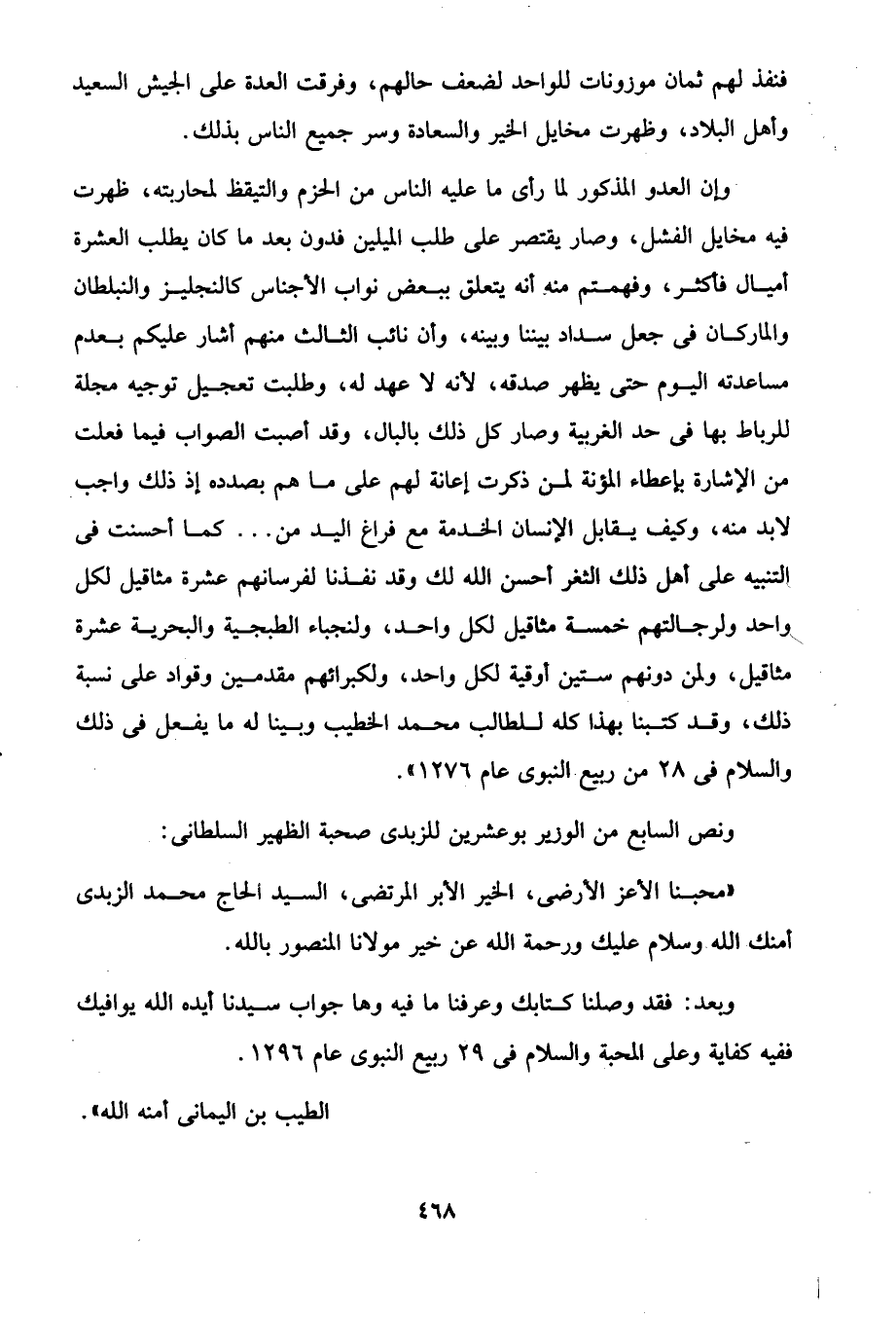 وإن العدو المذكور لما رأى ما عليه الناس من الحزم والتيقظ لمحاربته، ظهرت فيه مخايل الفشل، وصار يقتصر على طلب الميلين فدون بعد ما كان يطلب العشرة أميال فأكثر، وفهمتم منه أنه يتعلق ببعض نواب الأجناس كالنجليز والنبلطان والماركان في جعل سداد بيننا وبينه، وأن نائب الثالث منهم أشار عليكم بعدم مساعدته اليوم حتى يظهر صدقه، لأنه لا عهد له، وطلبت تعجيل توجيه مجلة للرباط بها في حد الغربية وصار كل ذلك بالبال، وقد أصبت الصواب فيما فعلت من الإشارة بإعطاء المؤنة لمن ذكرت إعانة لهم على ما هم بصدده إذ ذلك واجب لابد منه، وكيف يقابل الإنسان الخدمة مع فراغ اليد من ... كما أحسنت في التنبيه على أهل ذلك الثغر أحسن الله لك وقد نفذنا لفرسانهم عشرة مثاقيل لكل واحد ولرجالتهم خمسة مثاقيل لكل واحد، ولنجباء الطبجية والبحرية عشرة مثاقيل، ولمن دونهم ستين أوقية لكل واحد، ولكبرائهم مقدمين وقواد على نسبة ذلك، وقد كتبنا بهذا كله للطالب محمد الخطيب وبينا له ما يفعل في ذلك والسلام في 28 من ربيع النبوى عام 1276".