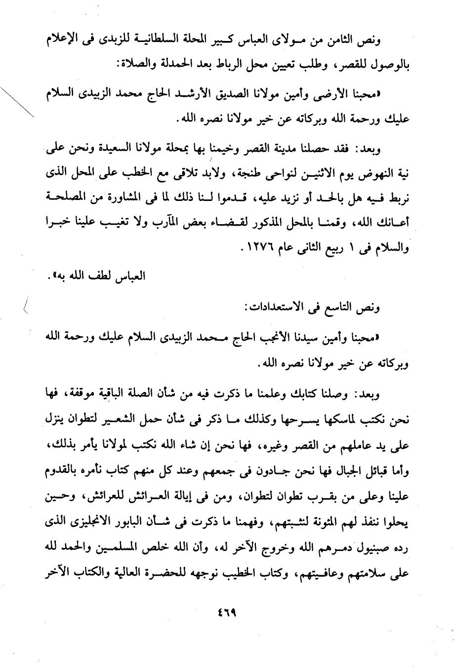 وبعد: فقد حصلنا مدينة القصر وخيمنا بها بمحلة مولانا السعيدة ونحن على نية النهوض يوم الاثنين لنواحى طنجة، ولابد تلاقى مع الخطب على المحل الذى نربط فيه هل بالحد أو نزيد عليه، قدموا لنا ذلك لما في المشاورة من المصلحة أعانك الله، وقمنا بالمحل المذكور لقضاء بعض المآرب ولا تغيب علينا خبرا والسلام في 1 ربيع الثانى عام 1276.