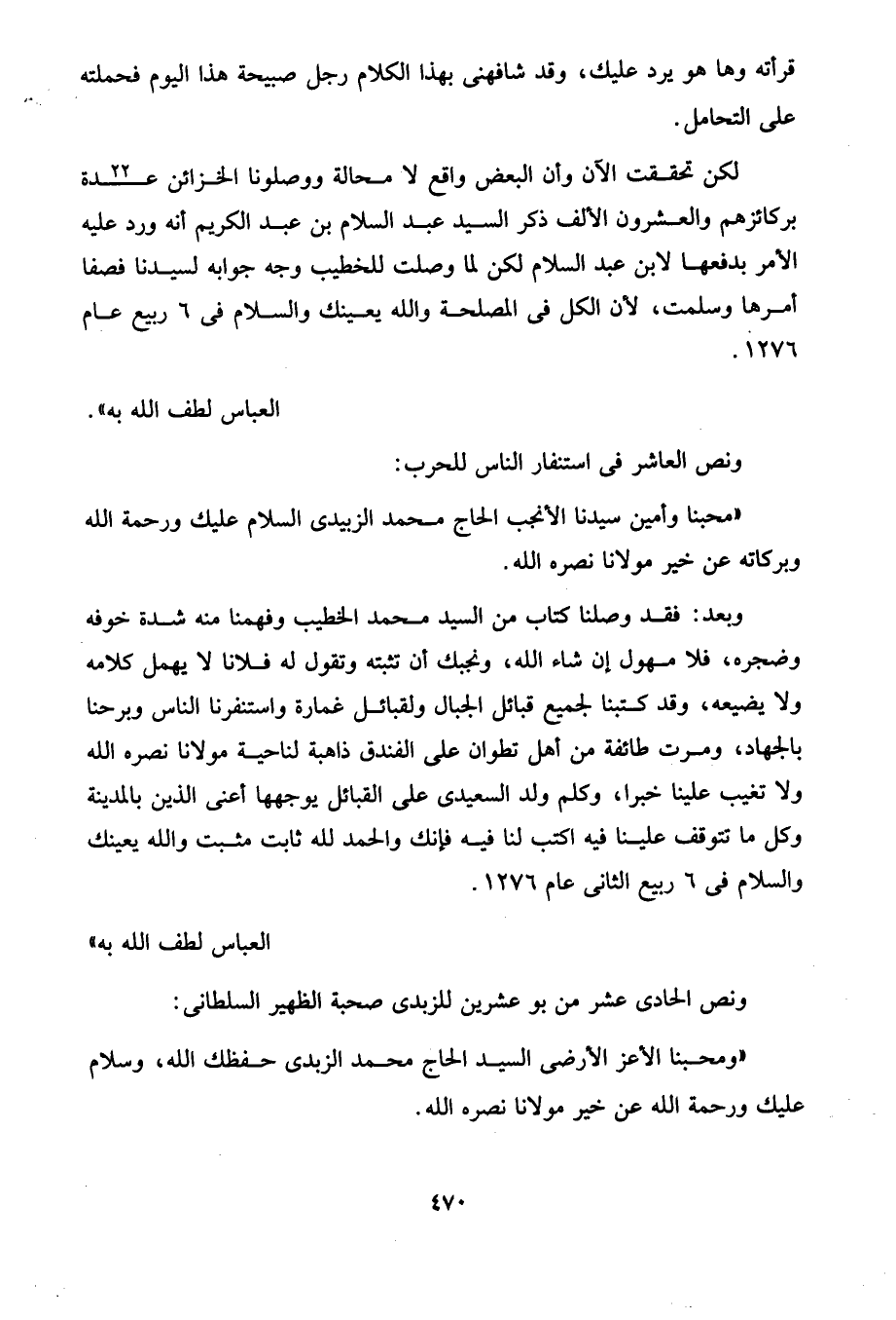 "ومحبنا الأعز الأرضى السيد الحاج محمد الزبدى حفظك الله، وسلام عليك ورحمة الله عن خير مولانا نصره الله.