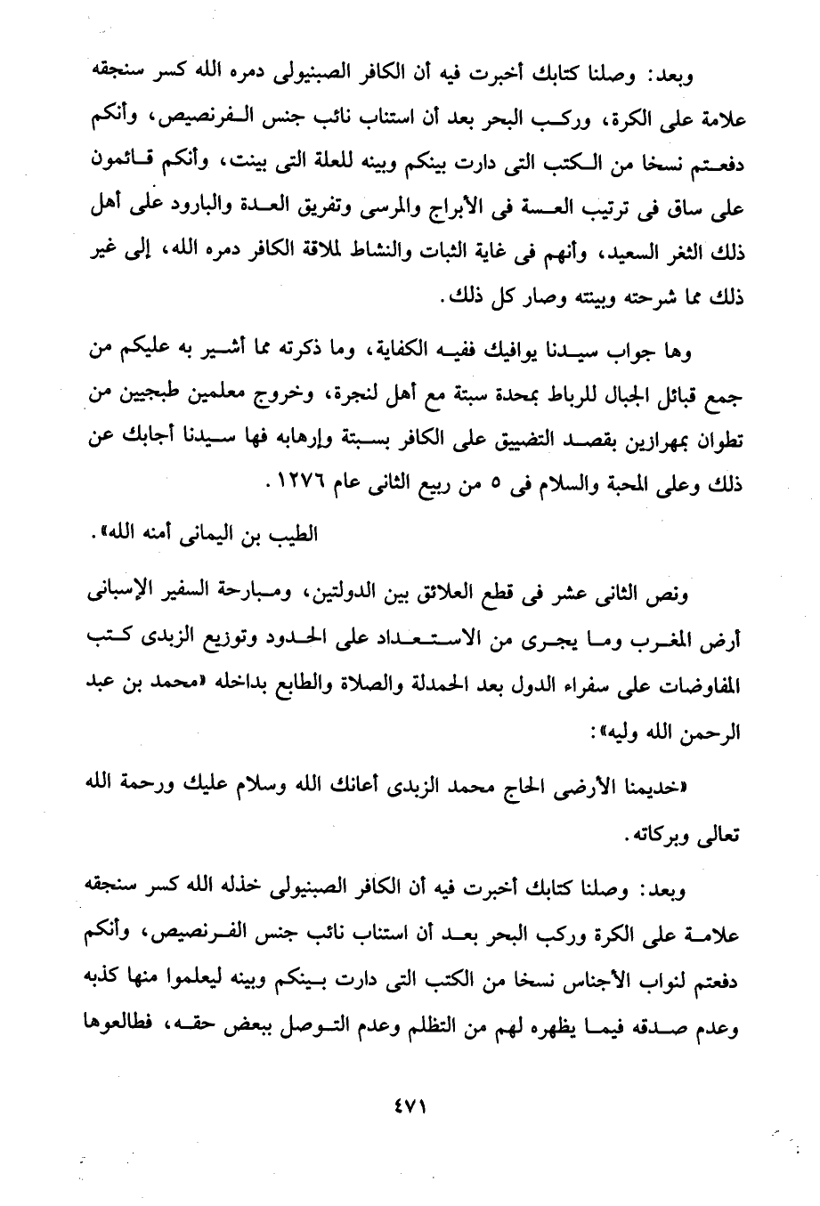 وبعد: وصلنا كتابك أخبرت فيه أن الكافر الصبنيولى دمره الله كسر سنجقه علامة على الكرة، وركب البحر بعد أن استناب نائب جنس الفرنصيص، وأنكم دفعتم نسخا من الكتب التي دارت بينكم وبينه للعلة التي بينت، وأنكم قائمون على ساق في ترتيب العسة في الأبراج والمرسى وتفريق العدة والبارود على أهل ذلك الثغر السعيد، وأنهم في غاية الثبات والنشاط لملاقة الكافر دمره الله، إلى غير ذلك مما شرحته وبينته وصار كل ذلك.
