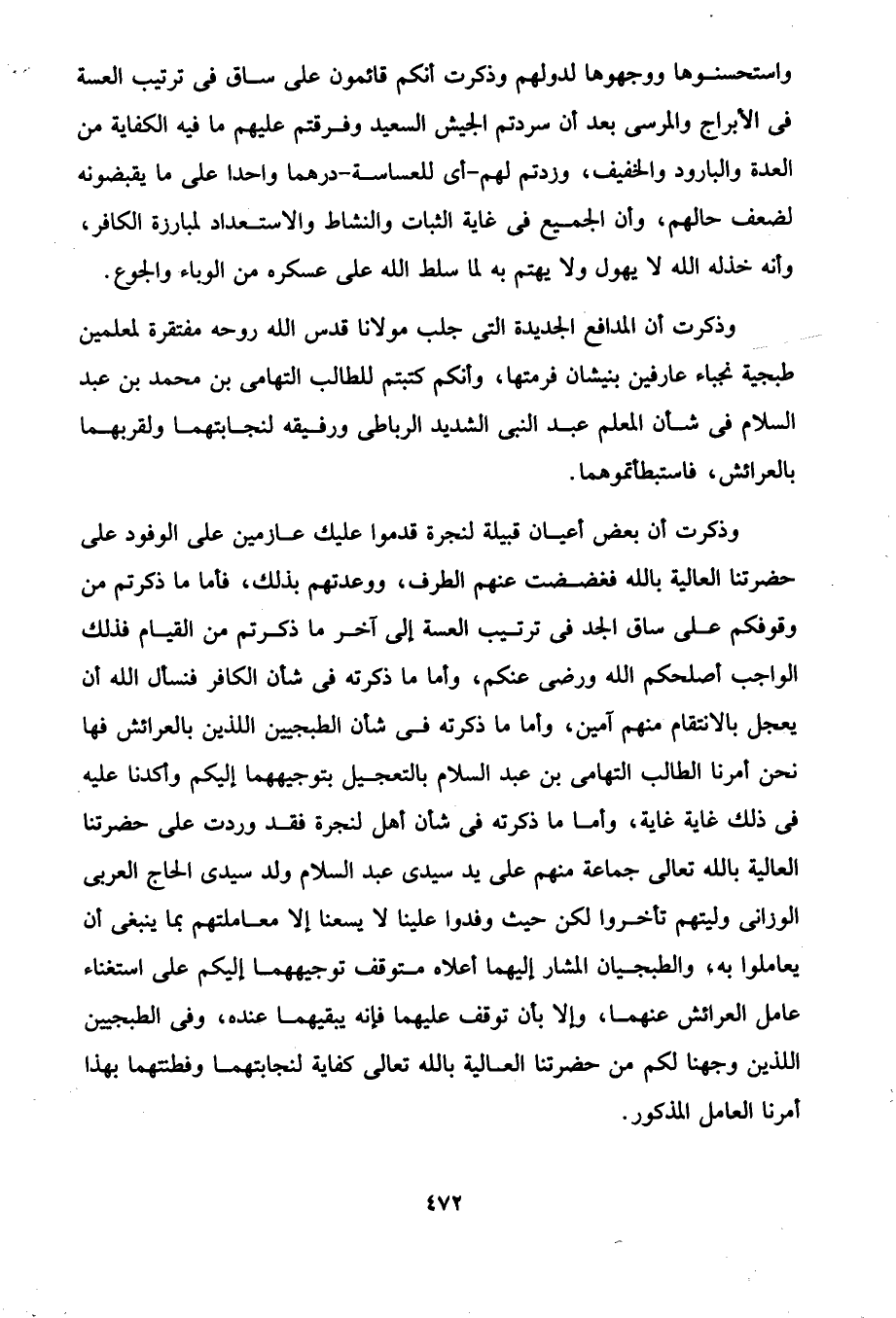 وذكرت أن بعض أعيان قبيلة لنجرة قدموا عليك عازمين على الوفود على حضرتنا العالية بالله فغضضت عنهم الطرف، ووعدتهم بذلك، فأما ما ذكرتم من وقوفكم على ساق الجد في ترتيب العسة إلى آخر ما ذكرتم من القيام فذلك الواجب أصلحكم الله ورضى عنكم، وأما ما ذكرته في شان الكافر فنسأل الله أن يعجل بالانتقام منهم آمين، وأما ما ذكرته في شأن الطبجيين اللذين بالعرائش فها نحن أمرنا الطالب التهامى بن عبد السلام بالتعجيل بتوجيههما إليكم وأكدنا عليه في ذلك غاية غاية، وأما ما ذكرته في شأن أهل لنجرة فقد وردت على حضرتنا العالية بالله تعالى جماعة منهم على يد سيدى عبد السلام ولد سيدى الحاج العربي الوزانى وليتهم تأخروا لكن حيث وفدوا علينا لا يسعنا إلا معاملتهم بما ينبغى أن يعاملوا به، والطبجيان المشار إليهما أعلاه متوقف توجيههما إليكم على استغناء عامل العرائش عنهما، وإلا بأن توقف عليهما فإنه يبقيهما عنده، وفى الطبجيين اللذين وجهنا لكم من حضرتنا العالية بالله تعالى كفاية لنجابتهما وفطنتهما بهذا أمرنا العامل المذكور.