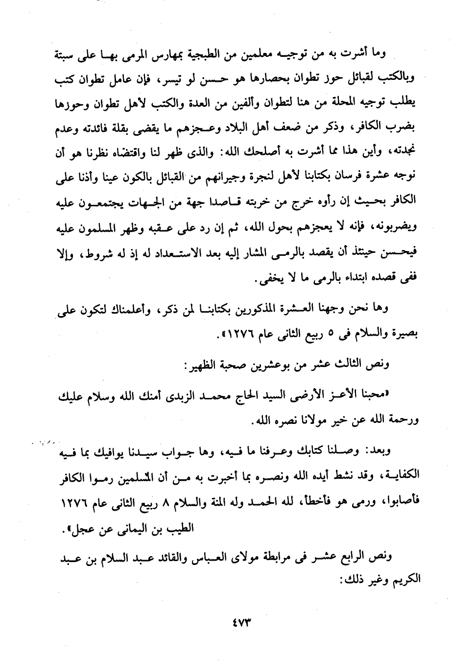 وبعد: وصلنا كتابك وعرفنا ما فيه، وها جواب سيدنا يوافيك بما فيه الكفاية، وقد نشط أيده الله ونصره بما أخبرت به من أن المسلمين رموا الكافر فأصابوا، ورمى هو فأخطأ، لله الحمد وله المئة والسلام 8 ربيع الثانى عام 1276