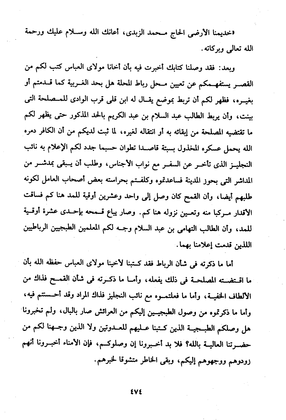 أما ما ذكرته في شأن الرباط فقد كتبنا لأخينا مولاى العباس حفظه الله بأن ما اقتضته المصلحة في ذلك يفعله، وأما ما ذكرته في شأن القمح فذاك من الألطاف الخفية، وأما ما فعلتموه مع نائب النجليز فذاك المراد وقد أحسنتم فيه، وأما ما ذكرتموه من وصول الطبجيين إليكم من العرائش صار بالبال، ولم تخبرونا هل وصلكم الطبجية الذين كتبنا عليهم للعدوتين ولا الذين وجهنا لكم من حضرتنا العالية بالله؟ فلا بد أخبرونا إن وصلوكم، فإن الأمناء أخبرونا أنهم زودوهم ووجهوهم إليكم، وبقى المخاطر متشوقا لخبرهم.