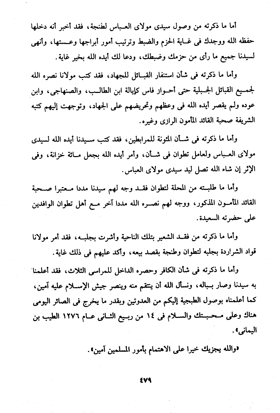 أما ما ذكرته من وصول سيدى مولاى العباس لطنجة، فقد أخبر أنه دخلها حفظه الله ووجدك في غاية الحزم والضبط وترتيب أمور أبراجها وعستها، وأنهى لسيدنا جميع ما رأى من حزمك وضبطك، ودعا لك أيده الله بخير غاية.