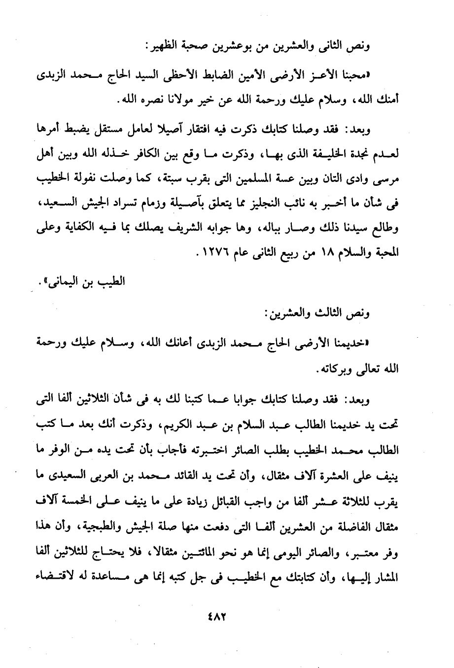 وبعد: فقد وصلنا كتابك ذكرت فيه افتقار آصيلا لعامل مستقل يضبط أمرها لعدم نجدة الخليفة الذى بها، وذكرت ما وقع بين الكافر خذله الله وبين أهل مرسى وادى التان وبين عسة المسلمين التي بقرب سبتة، كما وصلت نفولة الخطيب في شأن ما أخبر به نائب النجليز مما يتعلق بآصيلة وزمام تسراد الجيش السعيد، وطالع سيدنا ذلك وصار بباله، وها جوابه الشريف يصلك بما فيه الكفاية وعلى المحبة والسلام 18 من ربيع الثانى عام 1276.