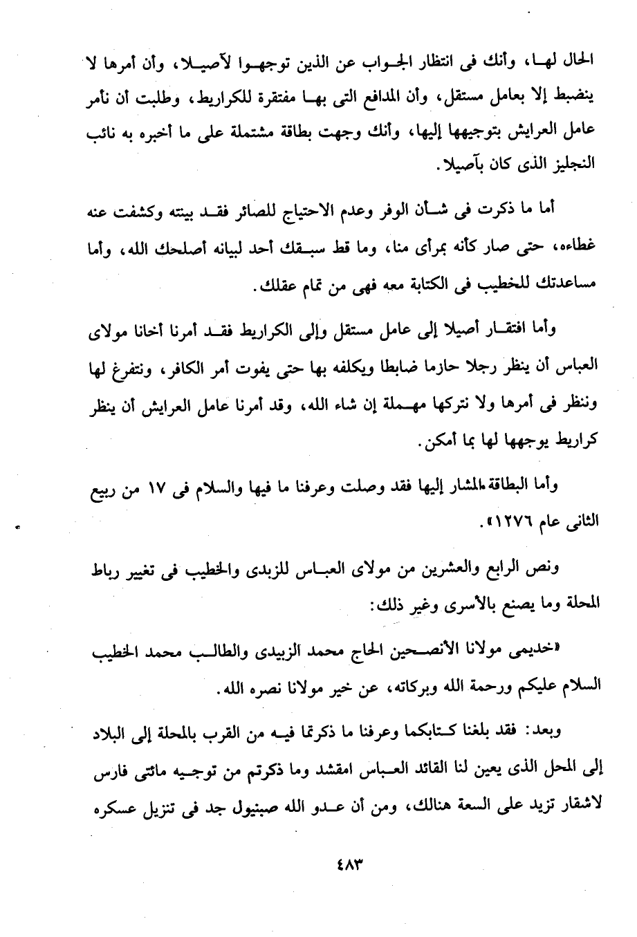 وبعد: فقد بلغنا كتابكما وعرفنا ما ذكرتما فيه من القرب بالمحلة إلى البلاد إلى المحل الذى يعين لنا القائد العباس امقشد وما ذكرتم من توجيه مائتى فارس لاشقار تزيد على السعة هنالك، ومن أن عدو الله صبنيول جد في تنزيل عسكره