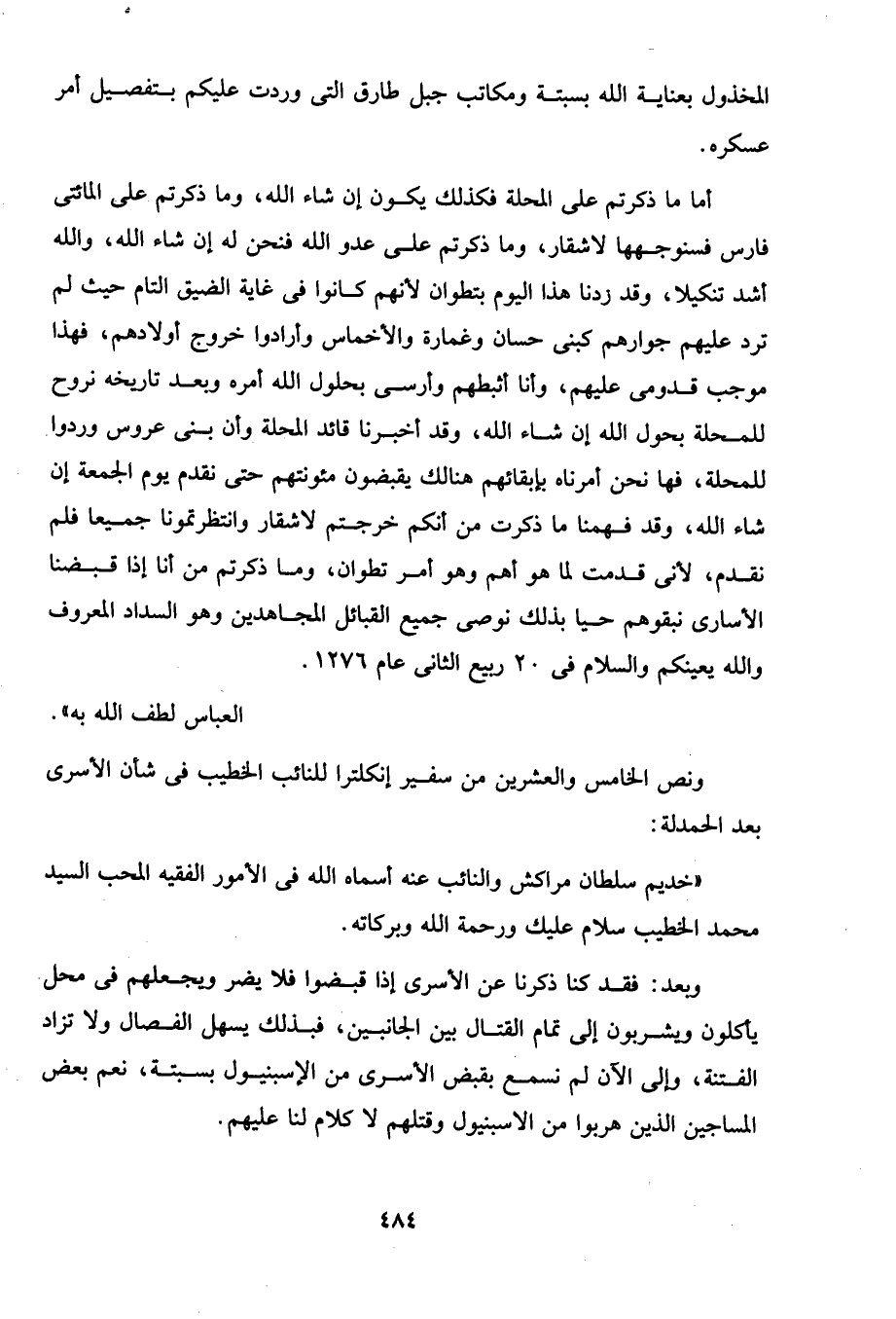أما ما ذكرتم على المحلة فكذلك يكون إن شاء الله، وما ذكرتم على المائتى فارس فسنوجهها لاشقار، وما ذكرتم على عدو الله فنحن له إن شاء الله، والله أشد تنكيلا، وقد زدنا هذا اليوم بتطوان لأنهم كانوا في غاية الضيق التام حيث لم ترد عليهم جوارهم كبنى حسان وغمارة والأخماس وأرادوا خروج أولادهم، فهذا موجب قدومى عليهم، وأنا أثبطهم وأرسى بحلول الله أمره وبعد تاريخه نروح للمحلة بحول الله إن شاء الله، وقد أخبرنا قائد المحلة وأن بنى عروس وردوا للمحلة، فها نحن أمرناه بإبقائهم هنالك يقبضون مئونتهم حتى نقدم يوم الجمعة إن شاء الله، وقد فهمنا ما ذكرت من أنكم خرجتم لاشقار وانتظرتمونا جميعا فلم نقدم، لأنى قدمت لما هو أهم وهو أمر تطوان، وما ذكرتم من أنا إذا قبضنا الأسارى نبقوهم حيا بذلك نوصى جميع القبائل المجاهدين وهو السداد المعروف والله يعينكم والسلام في 20 ربيع الثانى عام 1276.