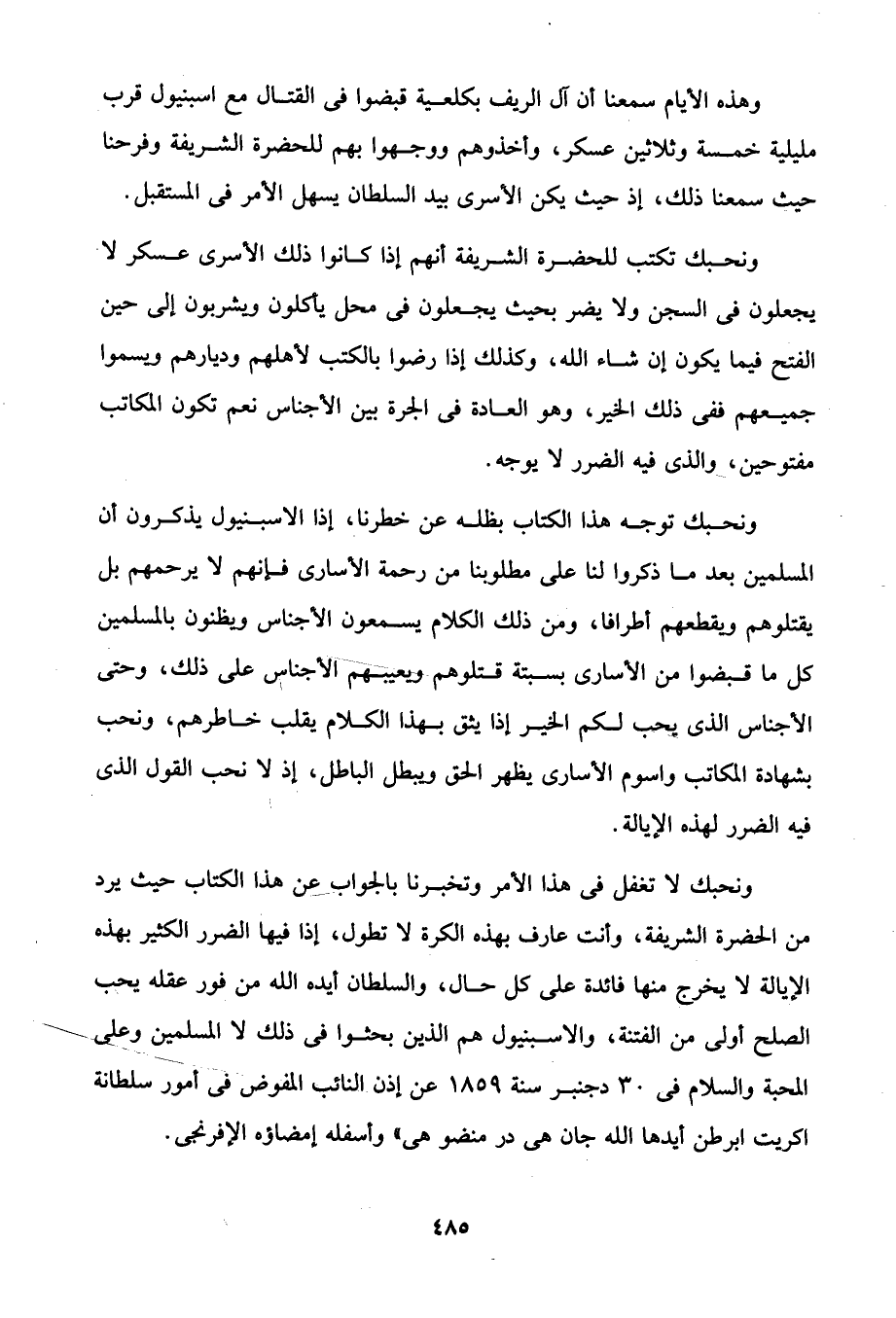 ونحبك توجه هذا الكتاب بظله عن خطرنا، إذا الاسبنيول يذكرون أن المسلمين بعد ما ذكروا لنا على مطلوبنا من رحمة الأسارى فإنهم لا يرحمهم بل يقتلوهم ويقطعهم أطرافا، ومن ذلك الكلام يسمعون الأجناس ويظنون بالمسلمين كل ما قبضوا من الأسارى بسبتة قتلوهم ويعيبهم الأجناس على ذلك، وحتى الأجناس الذى يحب لكم الخير إذا يثق بهذا الكلام يقلب خاطرهم، ونحب بشهادة المكاتب واسوم الأسارى يظهر الحق ويبطل الباطل، إذ لا نحب القول الذى فيه الضرر لهذه الإيالة.
