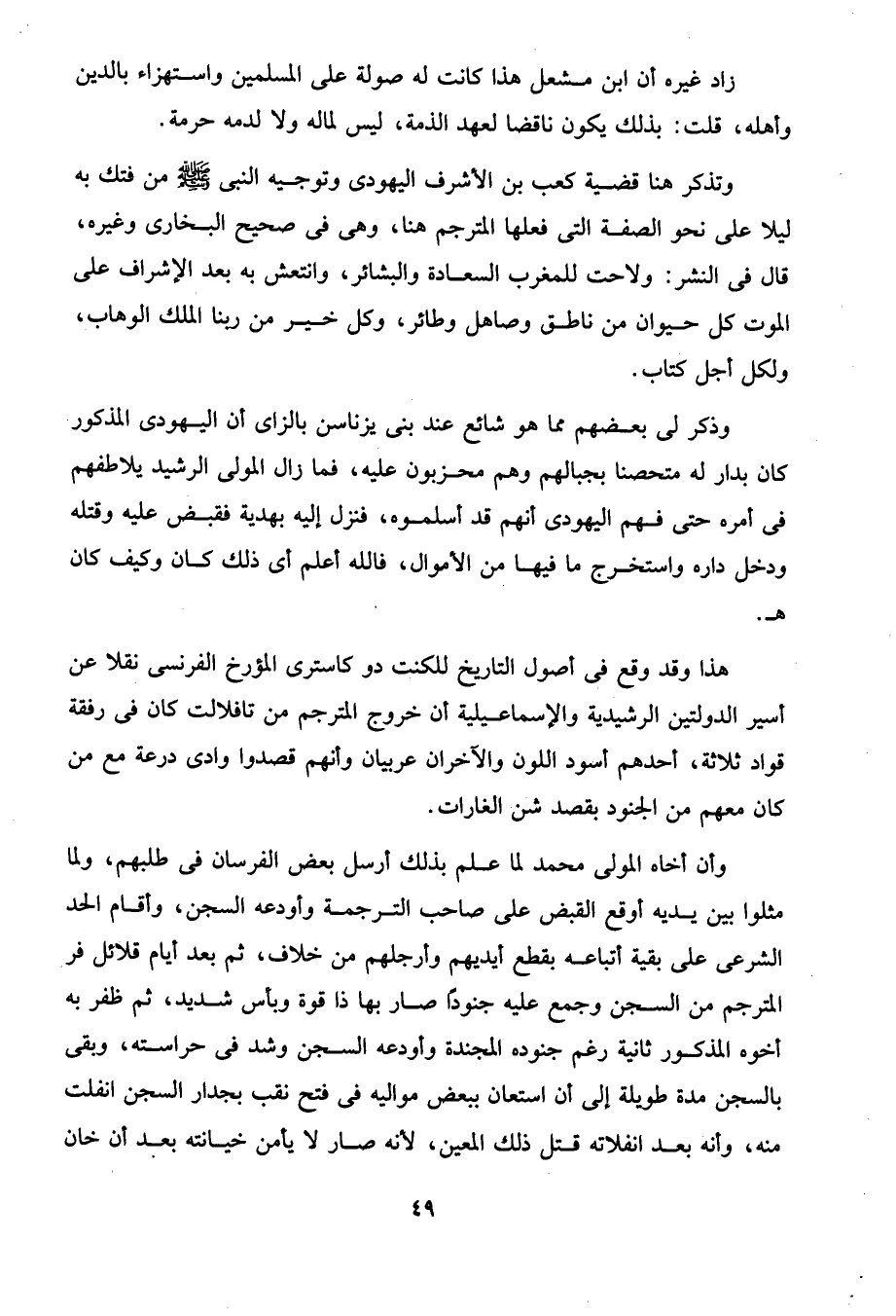 وتذكر هنا قضية كعب بن الأشرف اليهودى وتوجيه النبي -صلى الله عليه وسلم- من فتك به ليلا على نحو الصفة التي فعلها المترجم هنا، وهي في صحيح البخاري وغيره، قال في النشر: ولاحت للمغرب السعادة والبشائر، وانتعش به بعد الإشراف على الموت كل حيوان من ناطق وصاهل وطائر، وكل خير من ربنا الملك الوهاب، ولكل أجل كتاب.