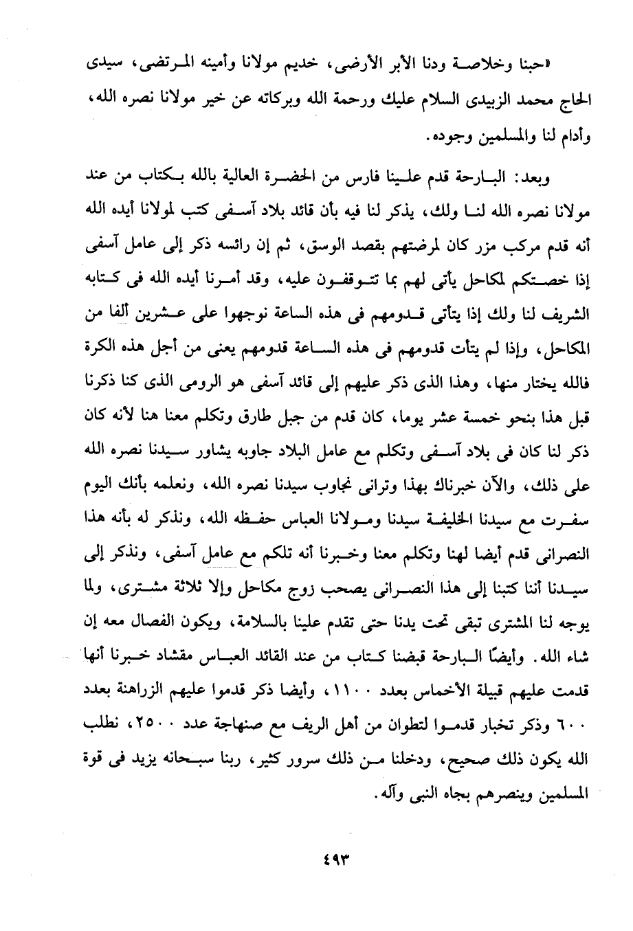 وبعد: البارحة قدم علينا فارس من الحضرة العالية بالله بكتاب من عند مولانا نصره الله لنا ولك، يذكر لنا فيه بأن قائد بلاد آسفى كتب لمولانا أيده الله أنه قدم مركب مزر كان لمرضتهم بقصد الوسق، ثم إن رائسه ذكر إلى عامل آسفى إذا خصتكم لمكاحل يأتي لهم بما تتوقفون عليه، وقد أمرنا أيده الله في كتابه الشريف لنا ولك إذا يتأتى قدومهم في هذه الساعة نوجهوا على عشرين ألفا من المكاحل، وإذا لم يتأت قدومهم في هذه الساعة قدومهم يعنى من أجل هذه الكرة فالله يختار منها، وهذا الذى ذكر عليهم إلى قائد آسفى هو الرومى الذى كنا ذكرنا قبل هذا بنحو خمسة عشر يوما، كان قدم من جبل طارق وتكلم معنا هنا لأنه كان ذكر لنا كان في بلاد آسفى وتكلم مع عامل البلاد جاوبه يشاور سيدنا نصره الله على ذلك، والآن خبرناك بهذا وترانى نجاوب سيدنا نصره الله، ونعلمه بأنك اليوم سفرت مع سيدنا الخليفة سيدنا ومولانا العباس حفظه الله، ونذكر له بأنه هذا النصرانى قدم أيضا لهنا وتكلم معنا وخبرنا أنه تلكم مع عامل آسفى، ونذكر إلى سيدنا أننا كتبنا إلى هذا النصرانى يصحب زوج مكاحل وإلا ثلاثة مشترى، ولما يوجه لنا المشتري تبقى تحت يدنا حتى تقدم علينا بالسلامة، ويكون الفصال معه إن شاء الله. وأيضًا البارحة قبضنا كتاب من عند القائد العباس مقشاد خبرنا أنها قدمت عليهم قيلة الأخماس بعدد 1100، وأيضا ذكر قدموا عليهم الزراهنة بعدد 600 وذكر تخبار قدموا لتطوان من أهل الريف مع صنهاجة عدد 2500، نطلب الله يكون ذلك صحيح، ودخلنا من ذلك سرور كثير، ربنا سبحانه يزيد في قوة المسلمين وينصرهم بجاه النبى وآله.