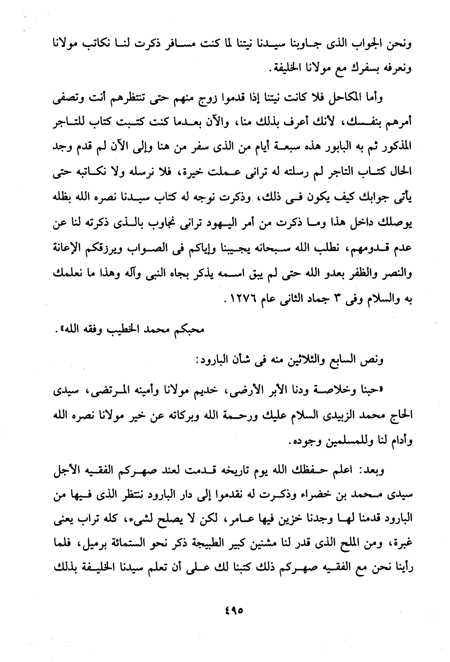 وأما المكاحل فلا كانت نيتنا إذا قدموا زوج منهم حتى تنتظرهم أنت وتصفى أمرهم بنفسك، لأنك أعرف بذلك منا، والآن بعدما كنت كتبت كتاب للتاجر المذكور ثم به البابور هذه سبعة أيام من الذى سفر من هنا وإلى الآن لم قدم وجد الحال كتاب التاجر لم رسلته له ترانى عملت خيرة، فلا نرسله ولا نكاتبه حتى يأتى جوابك كيف يكون في ذلك، وذكرت نوجه له كتاب سيدنا نصره الله بظله يوصلك داخل هذا وما ذكرت من أمر اليهود ترانى نجاوب بالذى ذكرته لنا عن عدم قدومهم، نطلب الله سبحانه يجيبنا وإياكم في الصواب ويرزقكم الإعانة والنصر والظفر بعدو الله حتى لم يبق اسمه يذكر بجاه النبى وآله وهذا ما نعلمك به والسلام وفى 3 جماد الثانى عام 1276.