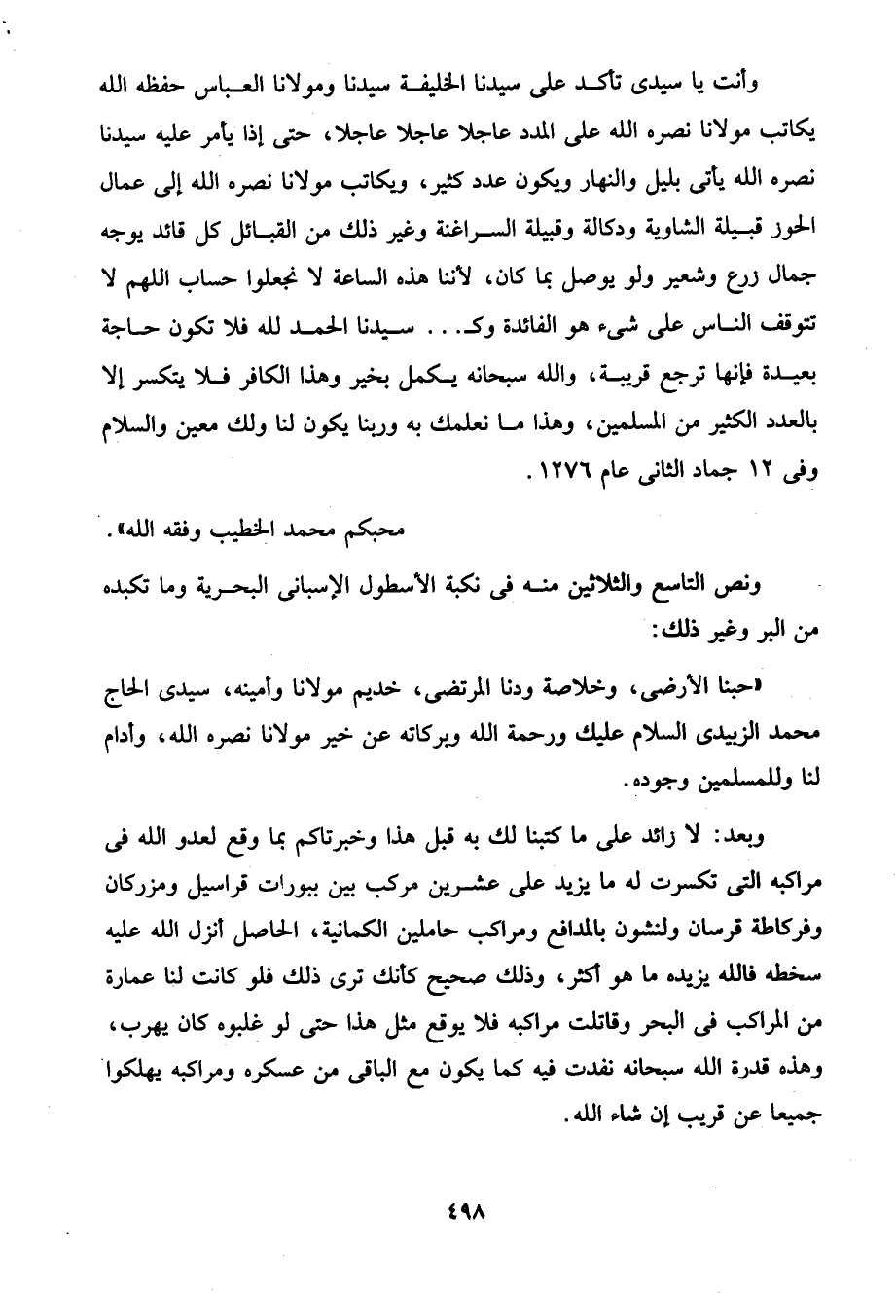وأنت يا سيدى تأكد على سيدنا الخليفة سيدنا ومولانا العباس حفظه الله يكاتب مولانا نصره الله على المدد عاجلا عاجلا عاجلا، حتى إذا يأمر عليه سيدنا نصره الله يأتى بليل والنهار ويكون عدد كثير، ويكاتب مولانا نصره الله إلى عمال الحوز قبيلة الشاوية ودكلالة وقبيلة السراغنة وغير ذلك من القبائل كل قائد يوجه جمال زرع وشعير ولو يوصل بما كان، لأننا هذه الساعة لا نجعلوا حساب اللهم لا تتوقف الناس على شئ هو الفائدة وكـ ... سيدنا الحمد لله فلا تكون حاجة بعيدة فإنها ترجع قريبة، والله سبحانه يكمل بخير وهذا الكافر فلا يتكسر إلا بالعدد الكثير من المسلمين، وهذا ما نعلمك به وربنا يكون لنا ولك معين والسلام وفى 12 جماد الثانى عام 1276.