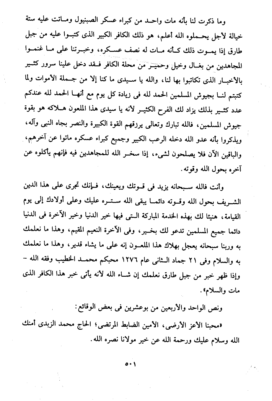 وأنت فالله سبحانه يزيد في قوتك ويعينك، فإنك تجرى على هذا الدين الشريف بحول الله وقوته دائما يبقى الله ستره عليك وعلى أولادك إلى يوم القيامة، هنيئا لك بهذه الخدمة المباركة التي فيها خير الدنيا وخير الآخرة في الدنيا دائما جميع المسلمين تدعو لك بخير، وفى الآخرة النعيم المقيم، وهذا ما نعلمك به ورينا سبحانه يعجل بهلاك هذا الملعون إنه على ما يشاء قدير، وهذا ما نعلمك به والسلام وفى 21 جماد الثانى عام 1276 محبكم محمد الخطيب وفقه الله -وإذا ظهر خبر من جبل طارق نعلمك إن شاء الله لأنه يأتى خبر هذا الكافر الذى مات والسلام".