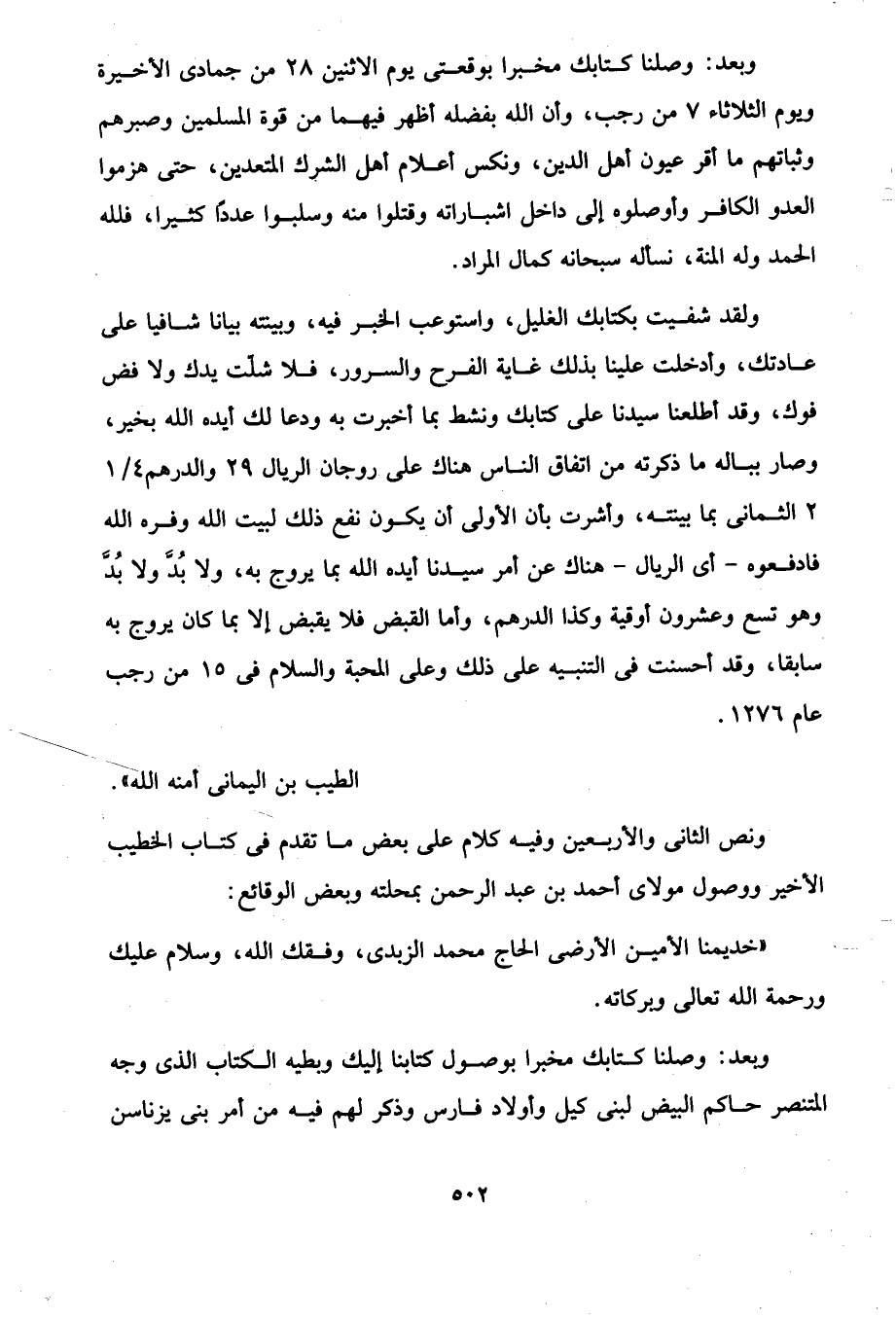 ولقد شفيت بكتابك الغليل، واستوعب الخبر فيه، وبينته بيانا شافيا على عادتك، وأدخلت علينا بذلك غاية الفرح والسرور، فلا شلّت يدك ولا فض فوك، وقد أطلعنا سيدنا على كتابك ونشط بما أخبرت به ودعا لك أيده الله بخير، وصار بباله ما ذكرته من اتفاق الناس هناك على روجان الريال 29 والدرهم 4/ 1 2 الثمانى بما بينته، وأشرت بأن الأولى أن يكون نفع ذلك لبيت الله وفره الله فادفعوه -أى الريال- هناك عن أمر سيدنا أيده الله بما يروج به، ولا بُدّ ولا بُدَّ وهو تسع وعشرون أوقية وكذا الدرهم، وأما القبض فلا يقبض إلا بما كان يروج به سابقا، وقد أحسنت في التنبيه على ذلك وعلى المحبة والسلام في 15 من رجب عام 1276.