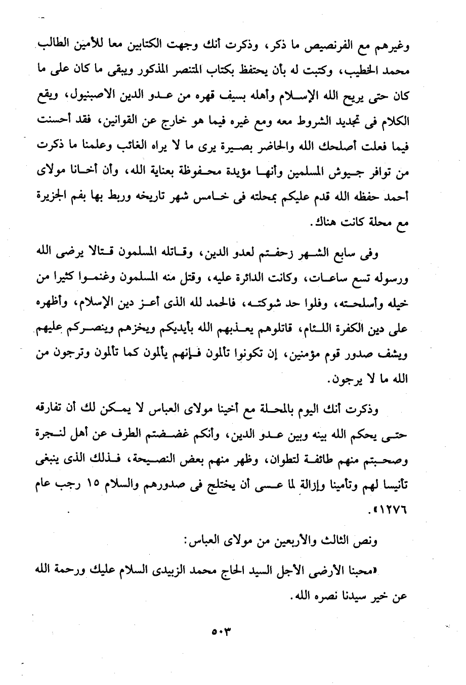 وذكرت أنك اليوم بالمحلة مع أخينا مولاى العباس لا يمكن لك أن تفارقه حتى يحكم الله بينه وبين عدو الدين، وأنكم غضضتم الطرف عن أهل لنجرة وصحبتم منهم طائفة لتطوان، وظهر منهم بعض النصيحة، فذلك الذى ينبغى تأنيسا لهم وتأمينا وإزالة لما عسى أن يختلج في صدورهم والسلام 15 رجب عام 1276"