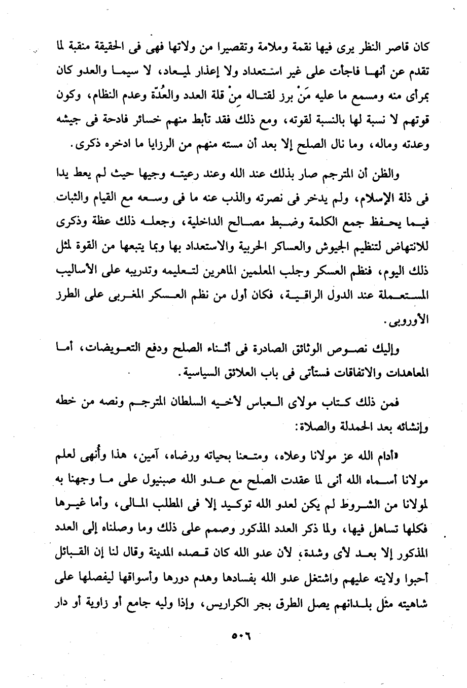 "أدام الله عز مولانا وعلاه، ومتعنا بحياته ورضاه، آمين، هذا وأنهى لعلم مولانا أسماه الله أنى لما عقدت الصلح مع عدو الله صبنيول على ما وجهنا به لمولانا من الشروط لم يكن لعدو الله توكيد إلا في المطلب المالى، وأما غيرها فكلها تساهل فيها، ولما ذكر العدد المذكور وصمم على ذلك وما وصلناه إلى العدد المذكور إلا بعد لأى وشدة؛ لأن عدو الله كان قصده المدينة وقال لنا إن القبائل أحبوا ولايته عليهم واشتغل عدو الله بفسادها وهدم دورها وأسواقها ليفصلها على شاهيته مثل بلدانهم يصل الطرق بجر الكراريس، وإذا وليه جامع أو زاوية أو دار