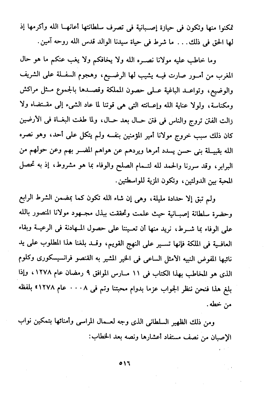 ولم تبق إلا حدادة مليلة، وهى إن شاء الله تكون كما بمضمن الشرط الرابع وحضرة سلطانة إصبانية حيث علمت وتحققت ببذل مجهود مولانا المنصور بالله على الوفاء بما شرط، يزيد منها أن تعيننا على حصول المهادنة في الرعية وبقاء العافية في الملكة فإنها تسير على المنهج القويم، وقد بلغنا هذا المطلوب على يد نائبها المفوض النبيه الأمثل الساعى في الخير المشير به القنصو فرانسيسكورى وكلوم الذى هو المخاطب بهذا الكتاب في 11 مارس الموافق 9 رمضان عام 1278، وإذا بلغ هذا فنحن ننظر الجواب عزما بدوام محبتنا وتم في 8 ... عام 1278" بلفظه من خطه.