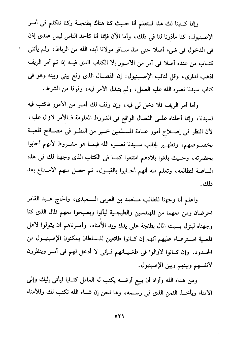 واعلم أنا وجهنا للطالب محمد بن العربي السعيدى، والحاج عبد القادر احرضان ومن معهما من المهندسين والطبجية ليأتوا ويصبحوا معهم المال الذى كنا وجهناه لينزل ببيت المال بطنجة على يدك ويد الأمناء، وأمرناهم أن يقولوا لأهل قلعية استرعاء عليهم أنهم إن كانوا طائعين للسلطان يمكنون الإصبنيول من الحدود، وإن كانوا لازالوا في طغيانهم فإنى لا أدخل لهم في أمر وينظرون لأنفسهم وبينهم وبين الإصبنيول.