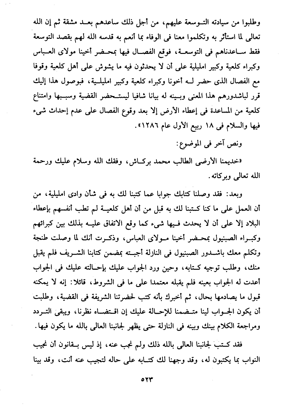 وطلبوا من سيادته التوسعة عليهم، من أجل ذلك ساعدهم بعد مشقة ثم إن الله تعالى لما استأثر به وتكلموا معنا في الوفاء بما أنعم به قدسه الله لهم بقصد التوسعة فقط ساعدناهم في التوسعة، فوقع الفصال فيها بمحضر أخينا مولاى العباس وكبراء كلعية وكبير امليلية على أن لا يحدثون فيه ما يشوش على أهل كلعية وقوفا مع الفصال الذى حضر له أخونا وكبراء كلعية وكبير امليلية، فبوصول هذا إليك قرر لباشدورهم هذا المعنى وبينه له بيانا شافيا ليستحضر القضية وسببها وامتناع كلعية من المساعدة في إعطاء الأرض إلا بعد وقوع الفصال على عدم إحداث شئ فيها والسلام في 18 ربيع الأول عام 1286".
