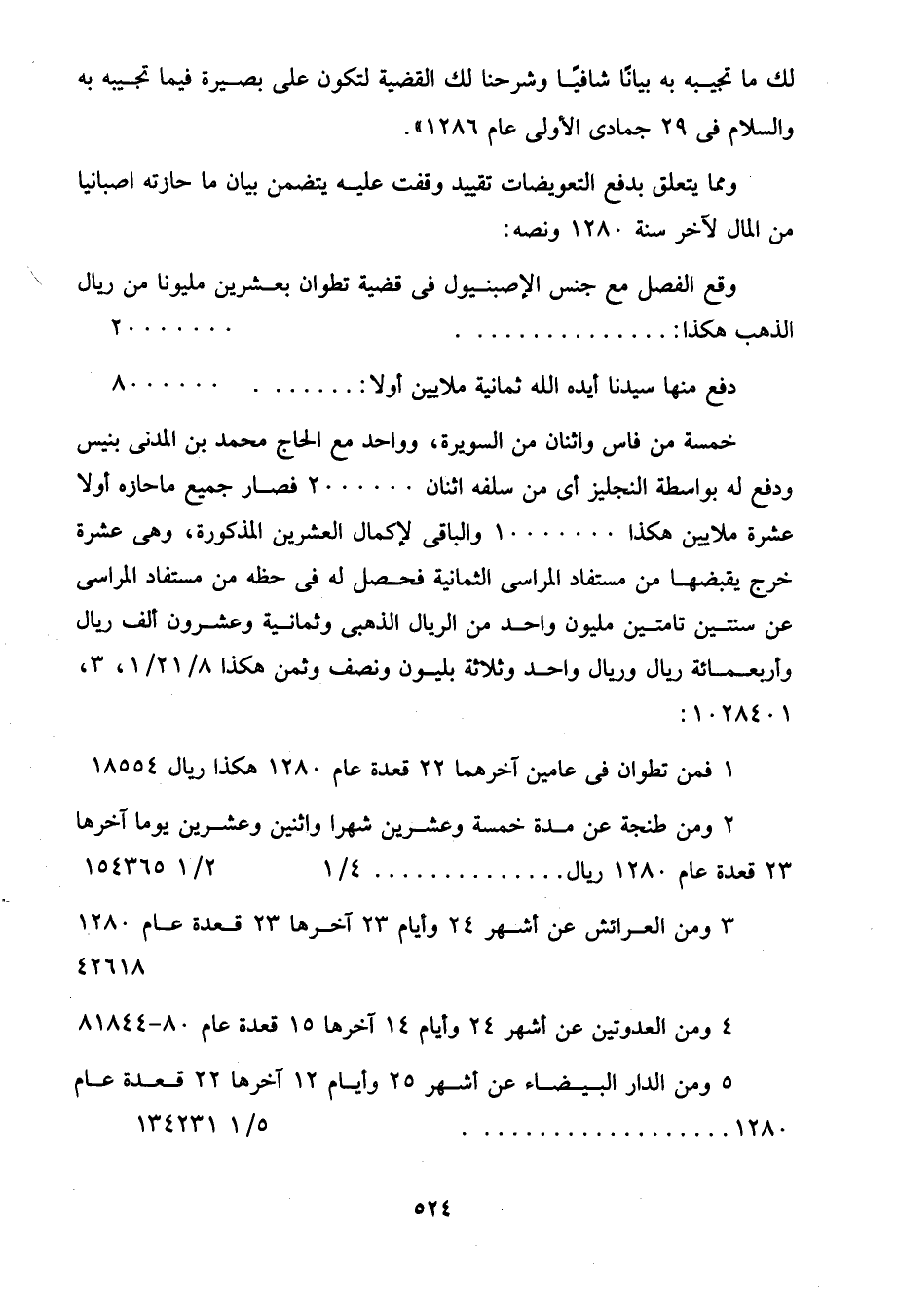 2 ومن طنجة عن مدة خمسة وعشرين شهرا واثنين وعشرين يوما آخرها 23 قعدة عام 1280 ريال ............... 1/ 24/ 2/ 1 154365