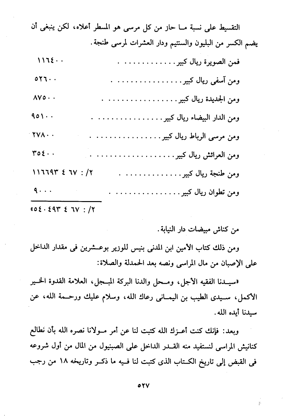 وبعد: فإنك كنت أعزك الله كتبت لنا عن أمر مولانا نصره الله بأن نطالع كنانيش المراسى لنستفيد منه القدر الداخل على الصبنيول من المال من أول شروعه في القبض إلى تاريخ الكتاب الذي كتبت لنا فيه ما ذكر وتاريخه 18 من رجب
