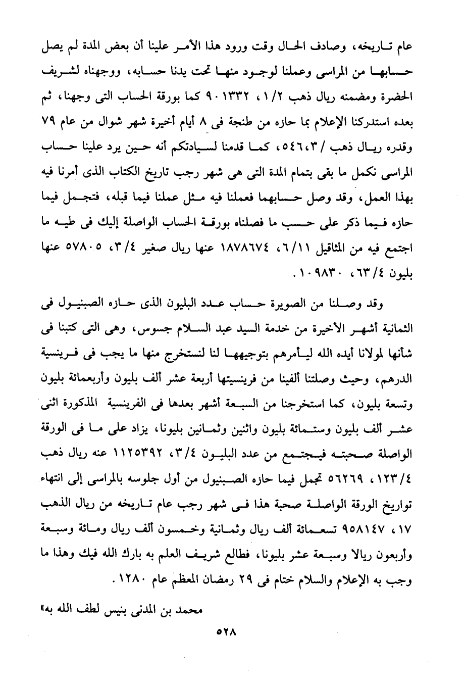 وقد وصلنا من الصويرة حساب عدد البليون الذى حازه الصبنيول في الثمانية أشهر الأخيرة من خدمة السيد عبد السلام جسوس، وهى التي كتبنا في شأنها لمولانا أيده الله ليأمرهم بتوجيهها لنا لنستخرج منها ما يجب في فرينسية الدرهم، وحيث وصلتنا ألفينا من فرينسيتها أربعة عشر ألف بليون وأربعمائة بليون وتسعة بليون، كما استخرجنا من السبعة أشهر بعدها في الفرينسية المذكورة اثنى عشر ألف بليون وستمائة بليون واثنين وثمانين بليونا، يزاد على ما في الورقة الواصلة صحبته فيجتمع من عدد البليون 3/ 4، 1125392 عنه ريال ذهب 4/ 123، 56269 تجمل فيما حازه الصبنيول من أول جلوسه بالمراسى إلى انتهاء تواريخ الورقة الواصلة صحبة هذا في شهر رجب عام تاريخه من ريال الذهب 17، 958147 تسعمائة ألف ريال وثمانية وخمسون ألف ريال ومائة وسبعة وأربعون ريالا وسبعة عشر بليونا، فطالع شريف العلم به بارك الله فيك وهذا ما وجب به الإعلام والسلام ختام في 29 رمضان المعظم عام 1280.