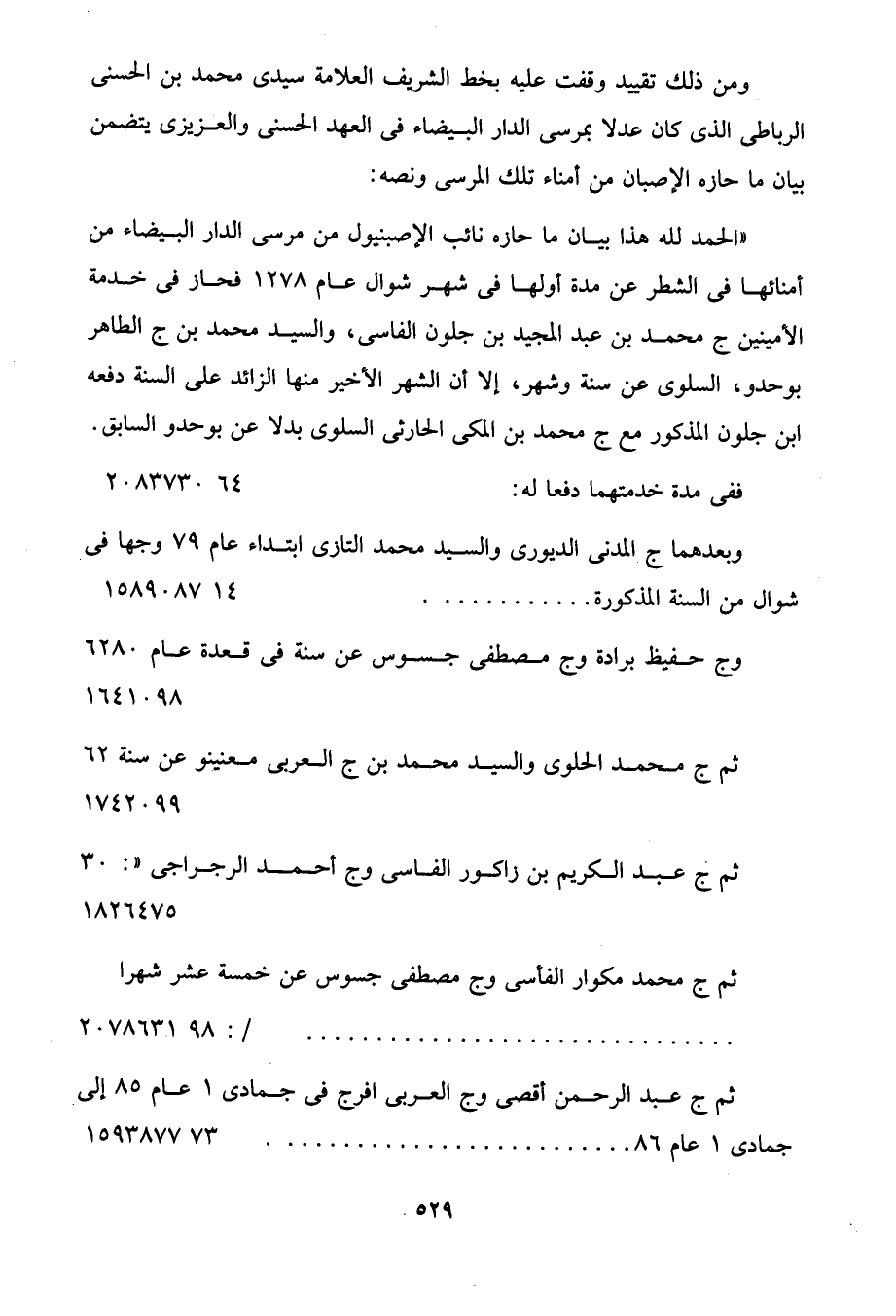 ومن ذلك تقييد وقفت عليه بخط الشريف العلامة سيدى محمد بن الحسنى الرباطى الذى كان عدلا بمرسى الدار البيضاء في العهد الحسنى والعزيزى يتضمن بيان ما حازه الإصبان من أمناء تلك المرسى ونصه: