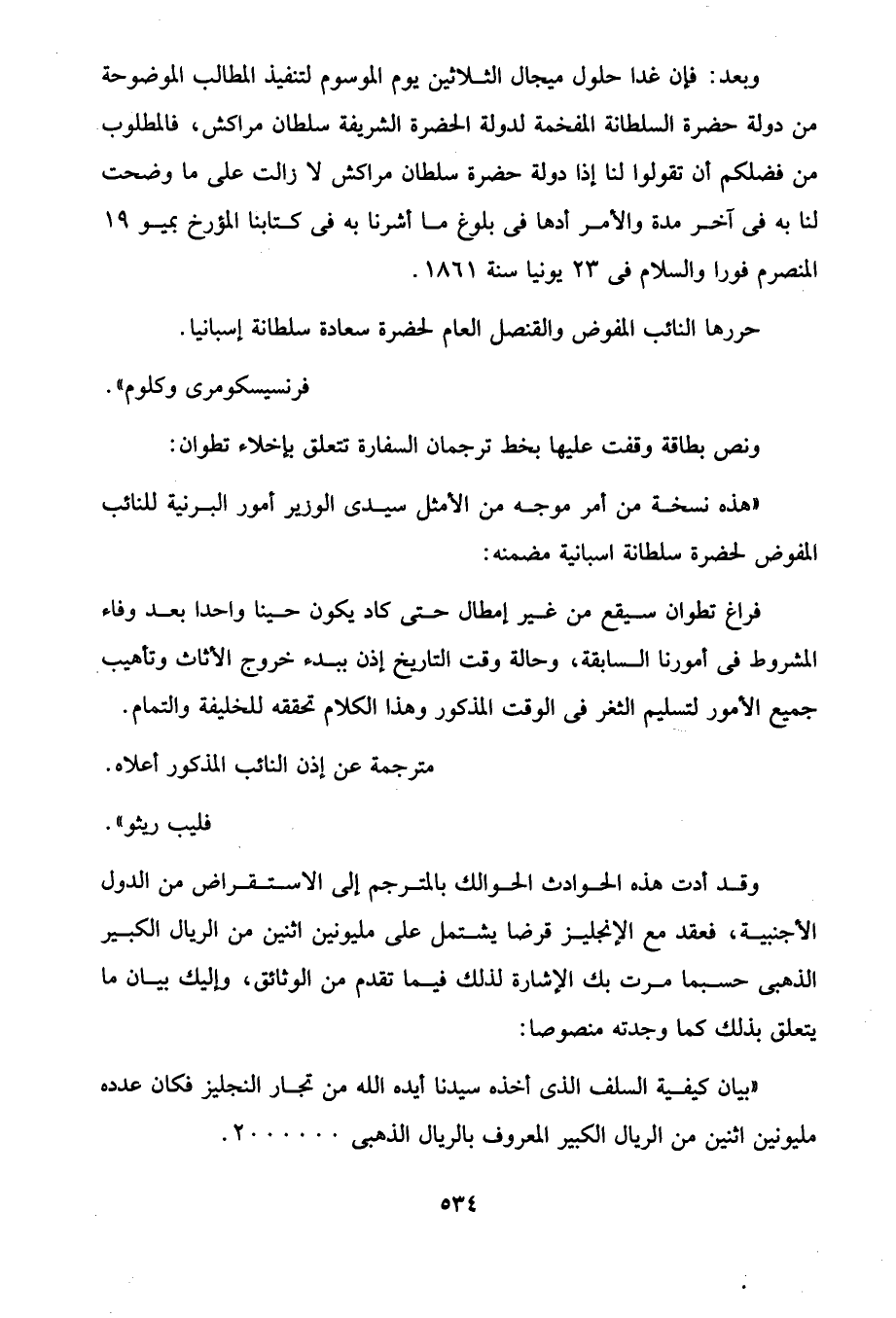 وبعد: فإن غدا حلول ميجال الثلاثين يوم الموسوم لتنفيذ المطالب الموضوحة من دولة حضرة السلطانة المفخمة لدولة الحضرة الشريفة سلطان مراكش، فالمطلوب من فضلكم أن تقولوا لنا إذا دولة حضرة سلطان مراكش لا زالت على ما وضحت لنا به في آخر مدة والأمر أدها في بلوغ ما أشرنا به في كتابنا المؤرخ بميو 19 المنصرم فورا والسلام في 23 يونيا سنة 1861.
