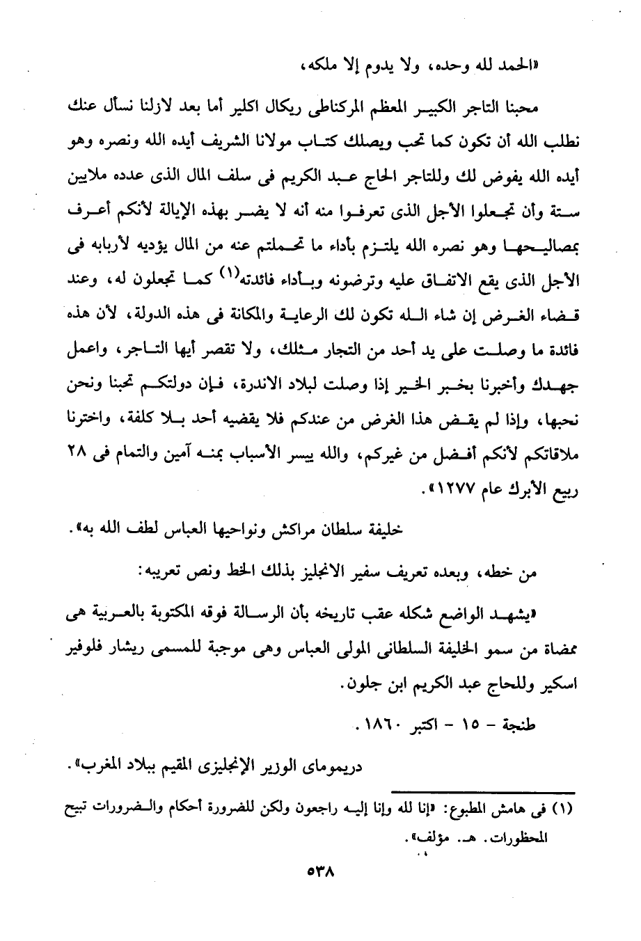 محبنا التاجر الكبير المعظم المركناطى ريكال اكلير أما بعد لازلنا نسأل عنك نطلب الله أن تكون كما تحب ويصلك كتاب مولانا الشريف أيده الله ونصره وهو أيده الله يفوض لك وللتاجر الحاج عبد الكريم في سلف المال الذي عدده ملايين ستة وأن تجعلوا الأجل الذي تعرفوا منه أنه لا يضر بهذه الإيالة لأنكم أعرف بمصاليحها وهو نصره الله يلتزم بأداء ما تحملتم عنه من المال يؤديه لأربابه في الأجل الذي يقع الاتفاق عليه وترضونه وبأداء فائدته (¬1) كما تجعلون له، وعند قضاء الغرض إن شاء الله تكون لك الرعاية والمكانة في هذه الدولة، لأن هذه فائدة ما وصلت على يد أحد من التجار مثلك، ولا تقصر أيها التاجر، واعمل جهدك وأخبرنا بخبر الخير إذا وصلت لبلاد الاندرة، فإن دولتكم تحبنا ونحن نحبها، وإذا لم يقض هذا الغرض من عندكم فلا يقضيه أحد بلا كلفة، واخترنا ملاقاتكم لأنكم أفضل من غيركم، والله ييسر الأسباب بمنه آمين والتمام في 28 ربيع الأبرك عام 1277".