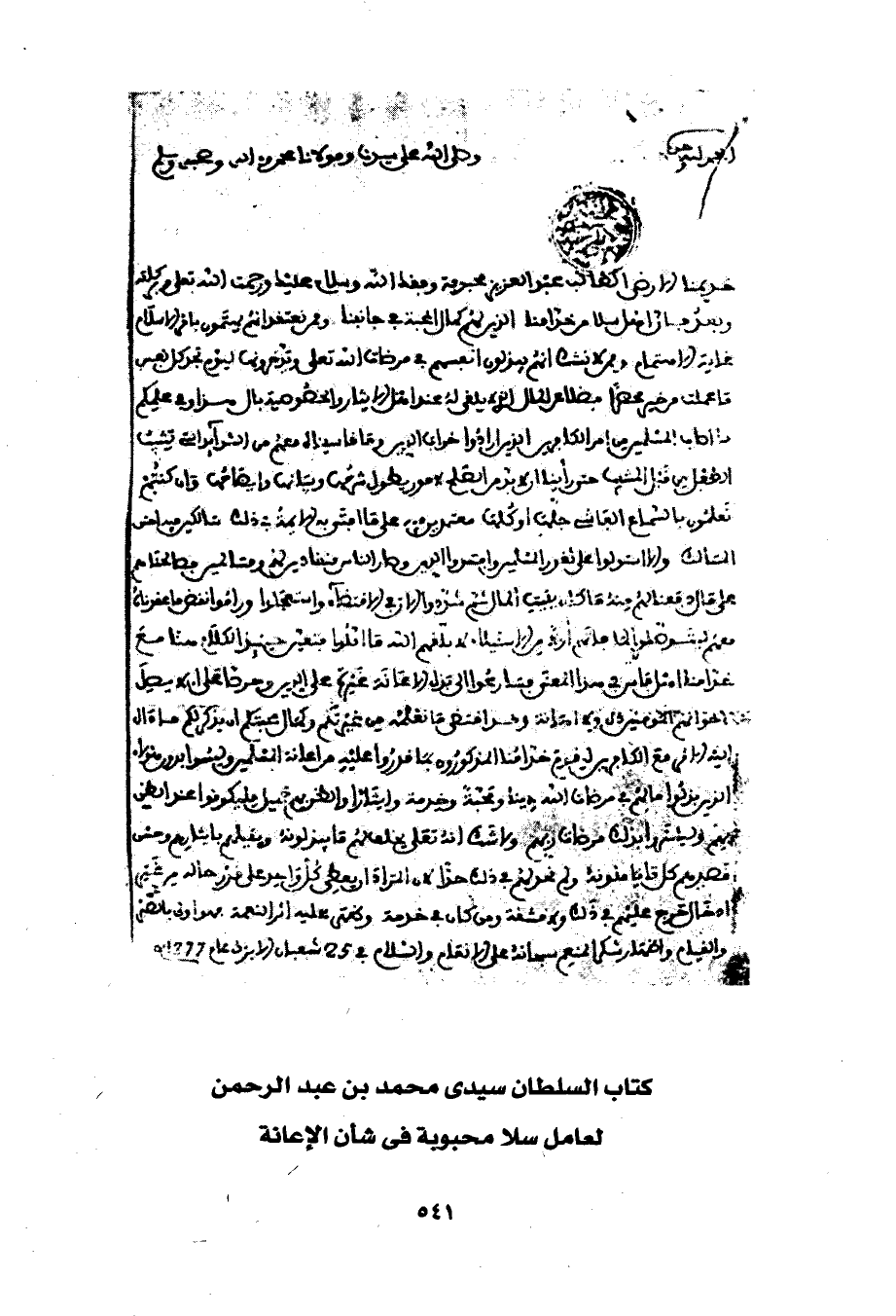 كتاب السلطان سيدى محمد بن عبد الرحمن لعامل سلا محبوبة في شأن الإعانة