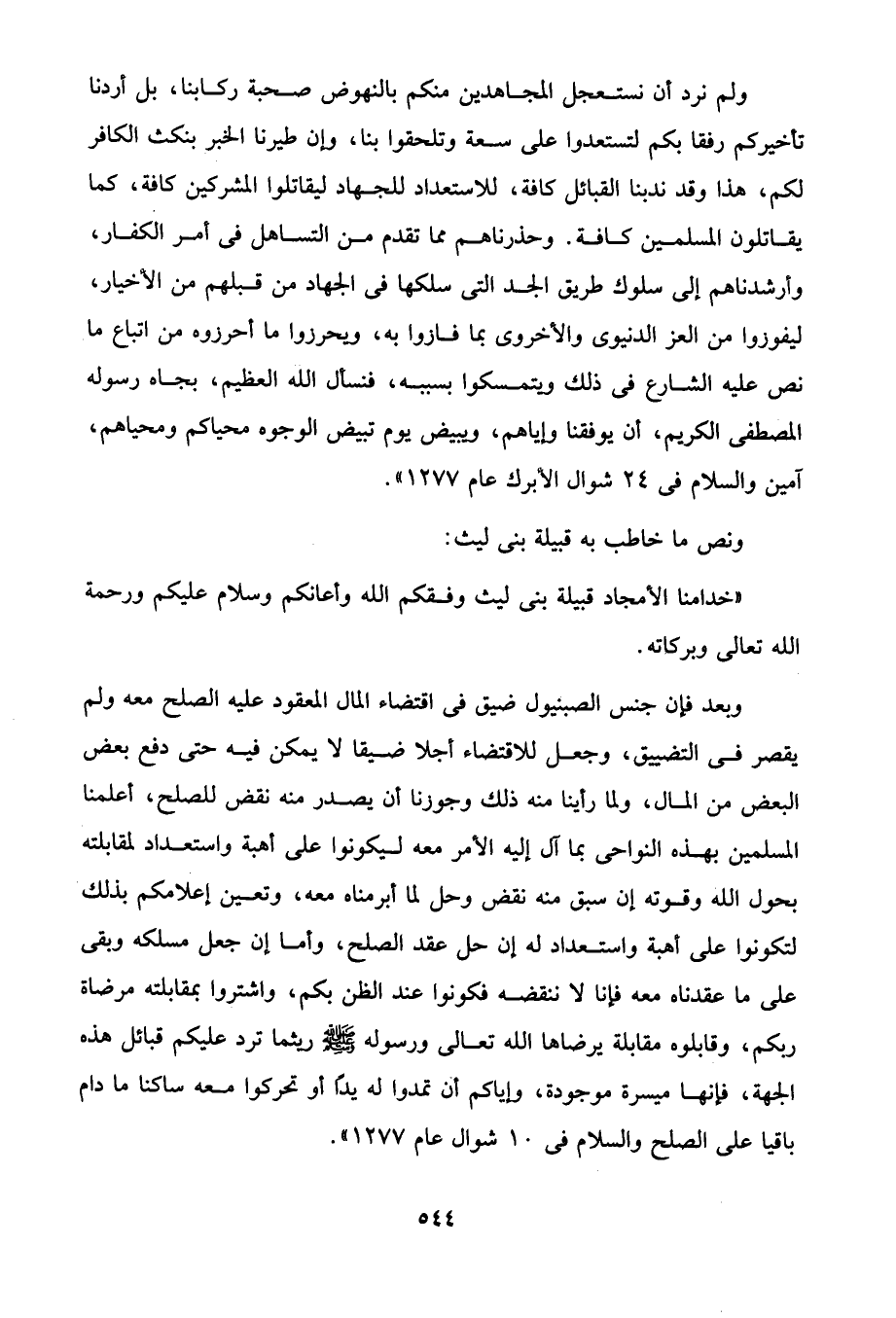 ولم نرد أن نستعجل المجاهدين منكم بالنهوض صحبة ركابنا، بل أردنا تأخيركم رفقا بكم لتستعدوا على سعة وتلحقوا بنا، كان طيرنا الخبر بنكث الكافر لكم، هذا وقد ندبنا القبائل كافة، للاستعداد للجهاد ليقاتلوا المشركين كافة، كما يقاتلون المسلمين كافة. وحذرناهم مما تقدم من التساهل في أمر الكفار، وأرشدناهم إلى سلوك طريق الجد التي سلكها في الجهاد من قبلهم من الأخيار، ليفوزوا من العز الدنيوى والأخروى بما فازوا به، ويحرزوا ما أحرزوه من اتباع ما نص عليه الشارع في ذلك ويتمسكوا بسببه، فنسأل الله العظيم، بجاه رسوله المصطفى الكريم، أن يوفقنا وإياهم، ويبيض يوم تبيض الوجوه محياكم ومحياهم، آمين والسلام في 24 شوال الأبرك عام 1277".