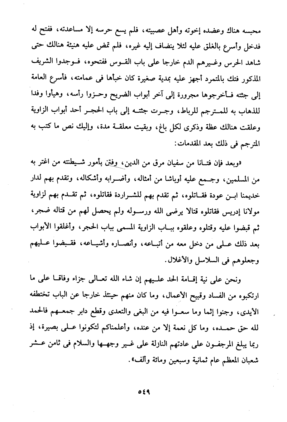 ونحن على نية إقامة الحد عليهم إن شاء الله تعالى جزاء وفاقا على ما ارتكبوه من الفساد وقبيح الأعمال، وما كان منهم حينئذ خارجا عن الباب تختطفه الأيدى، وجنوا إنّما وما سعوا فيه من البغى والتعدى وقطع دابر جمعهم فالحمد لله حق حمده، وما كل نعمة إلا من عنده، وأعلمناكم لتكونوا على بصيرة، إذ ربما يبلغ المرجفون على عادتهم النازلة على غير وجهها والسلام في ثامن عشر شعبان المعظم عام ثمانية وسبعين ومائة وألف".