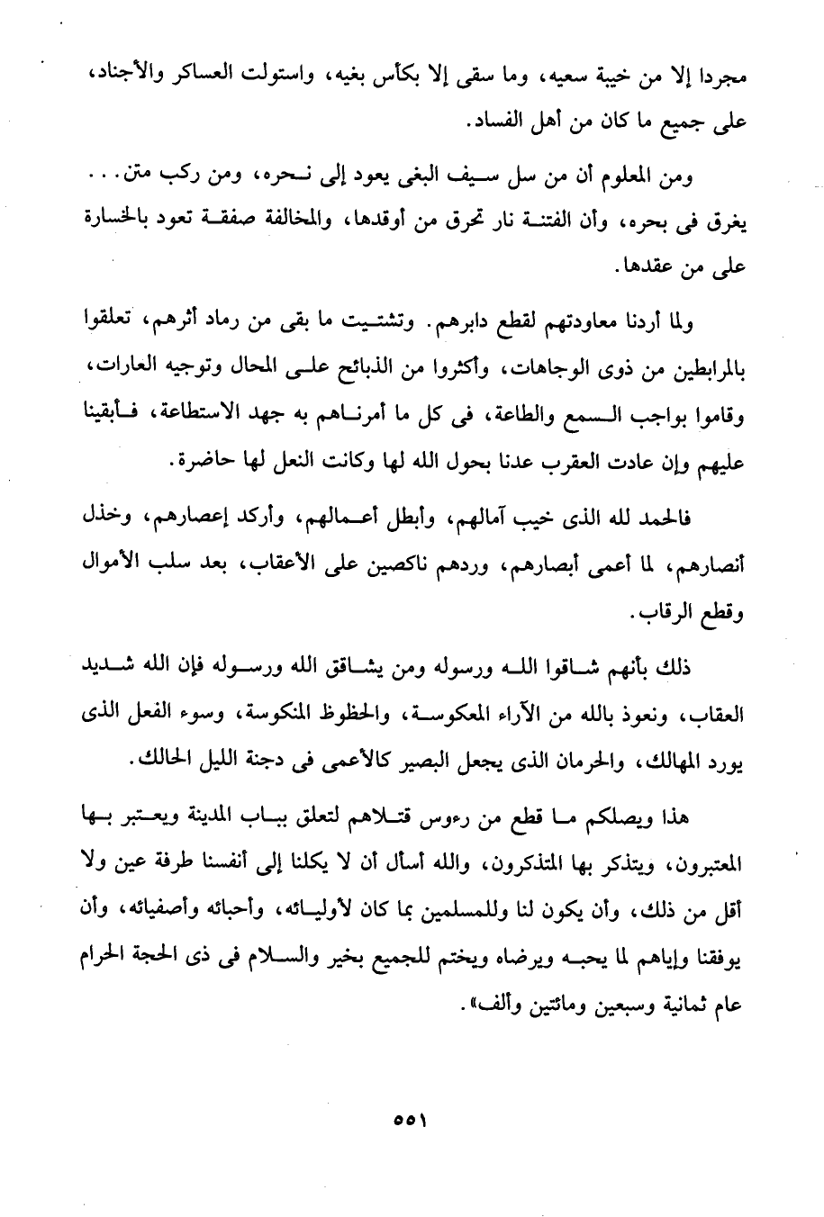فالحمد لله الذى خيب آمالهم، وأبطل أعمالهم، وأركد إعصارهم، وخذل أنصارهم، لما أعمى أبصارهم، وردهم ناكصين على الأعقاب، بعد سلب الأموال وقطع الرقاب.
