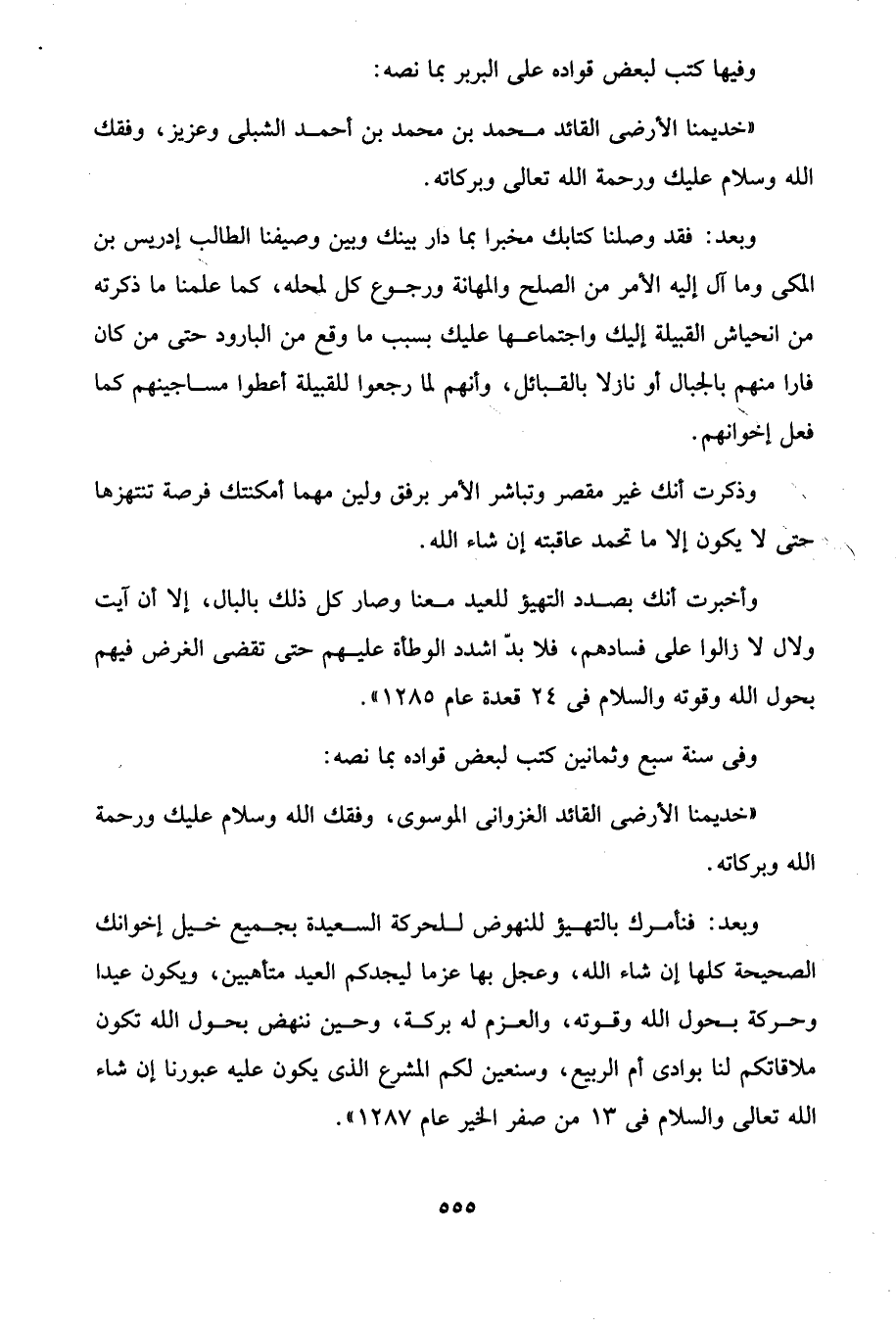 وبعد: فقد وصلنا كتابك مخبرا بما دار بينك وبين وصيفنا الطالب إدريس بن المكى وما آل إليه الأمر من الصلح والمهانة ورجوع كل لمحله، كما علمنا ما ذكرته من انحياش القبيلة إليك واجتماعها عليك بسبب ما وقع من البارود حتى من كان فارا منهم بالجبال أو نازلا بالقبائل، وأنهم لما رجعوا للقبيلة أعطوا مساجينهم كما فعل إخوانهم.