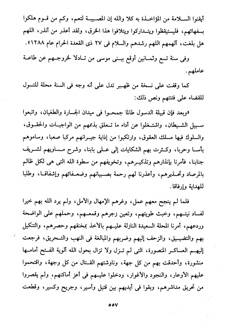 "وبعد فإن قبيلة الدسول طالما جمحوا في ميدان الجسارة والطغيان، واتبعوا سبيل الشيطان، واشتغلوا عن أداء ما تعلق بذممهم من الواجبات والحقوق، والسلوك فيها مسلك العقوق، وارتكبوا من إذاية جيرانهم مركبا صعبا، وساموهم بأسا وحربا، وكثرت بهم الشكايات إلى على بابنا، وشرح مساويهم لشريف جنابنا، فأمرنا بإنذارهم وتذكيرهم، وتخويفهم من سطوة الله التي هى لكل ظالم بالمرصاد وتحذيرهم، وأعذرنا لهم رحمة بصبيانهم وضعفائهم وإشفاقا، وطلبا للهداية وإرفاقا.