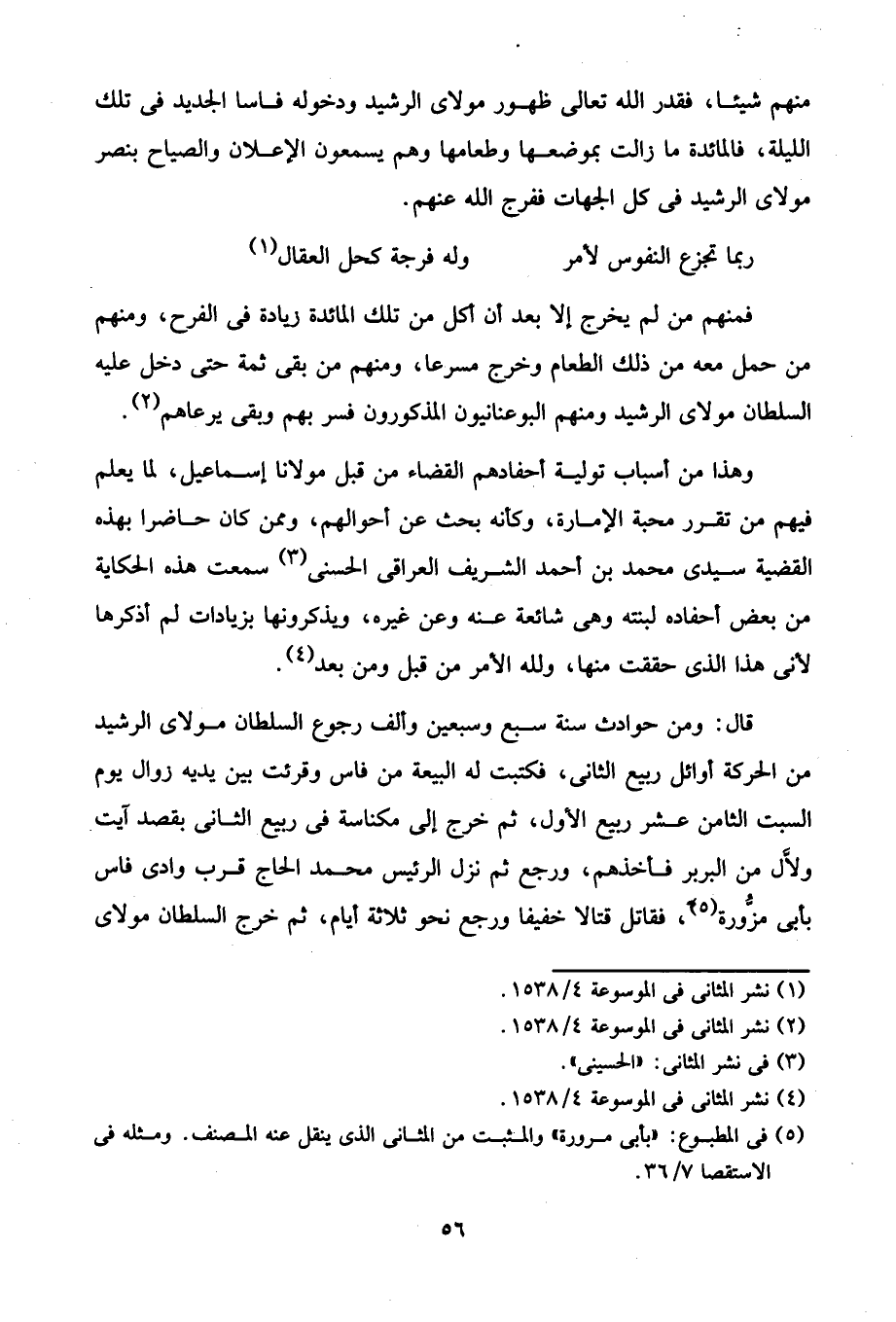 فمنهم من لم يخرج إلا بعد أن كل من تلك المائدة زيادة في الفرح، ومنهم من حمل معه من ذلك الطعام وخرج مسرعا، ومنهم من بقى ثمة حتَّى دخل عليه السلطان مولاى الرشيد ومنهم البوعنانيون المذكورون فسر بهم وبقى يرعاهم (¬2).