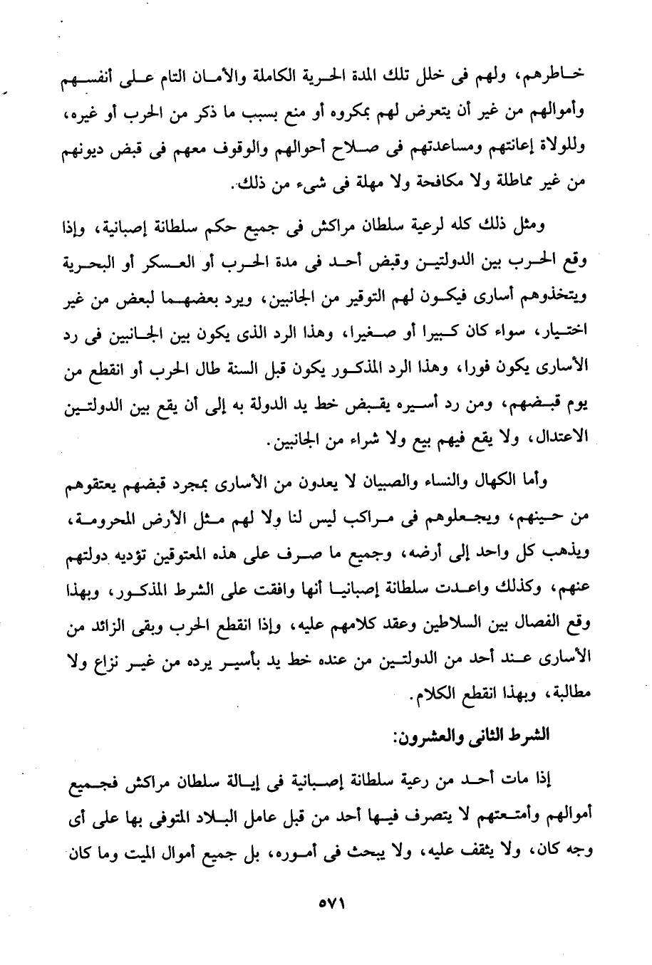 ومثل ذلك كله لرعية سلطان مراكش في جميع حكم سلطانة إصبانية، وإذا وقع الحرب بين الدولتين وقبض أحد في مدة الحرب أو العسكر أو البحرية ويتخذوهم أسارى فيكون لهم التوقير من الجانبين، ويرد بعضهما لبعض من غير اختيار، سواء كان كبيرا أو صغيرا، وهذا الرد الذى يكون بين الجانبين في رد الأسارى يكون فورا، وهذا الرد المذكور يكون قبل السنة طال الحرب أو انقطع من يوم قبضهم، ومن رد أسيره يقبض خط يد الدولة به إلى أن يقع بين الدولتين الاعتدال، ولا يقع فيهم بيع ولا شراء من الجانبين.