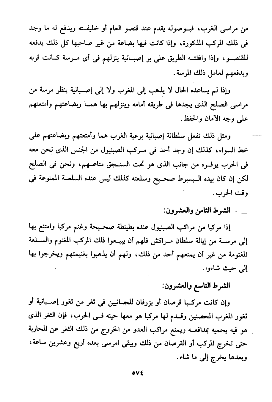 ومثل ذلك تفعل سلطانة إصبانية برعية الغرب هما وأمتعتهم وبضاعتهم على خط السواء، كذلك إن وجد أحد في مركب الصبنيول من الجنس الذى نحن معه في الحرب يوفره من جانب الذى هو تحت السنجق متاعهم، ونحن في الصلح لكن إن كان بيده البسبرط صحيح وسلعته كذلك ليس عنده السلعة الممنوعة في وقت الحرب.