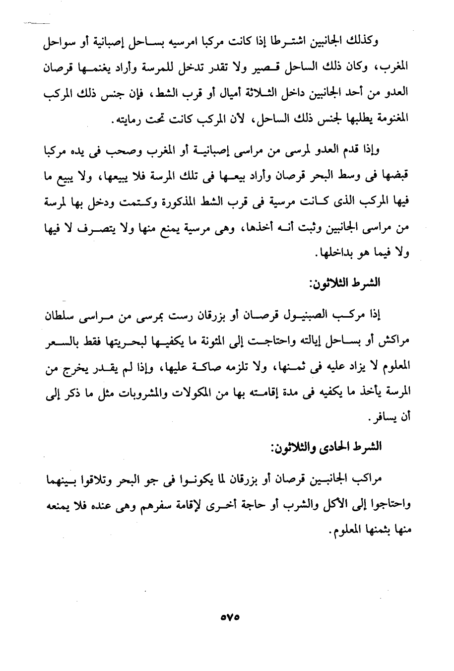 وكذلك الجانبين اشترطا إذا كانت مركبا امرسيه بساحل إصبانية أو سواحل المغرب، وكان ذلك الساحل قصير ولا تقدر تدخل للمرسة وأراد يغنمها قرصان العدو من أحد الجانبين داخل الثلاثة أميال أو قرب الشط، فإن جنس ذلك المركب المغنومة يطلبها لجنس ذلك الساحل، لأن المركب كانت تحت رمايته.