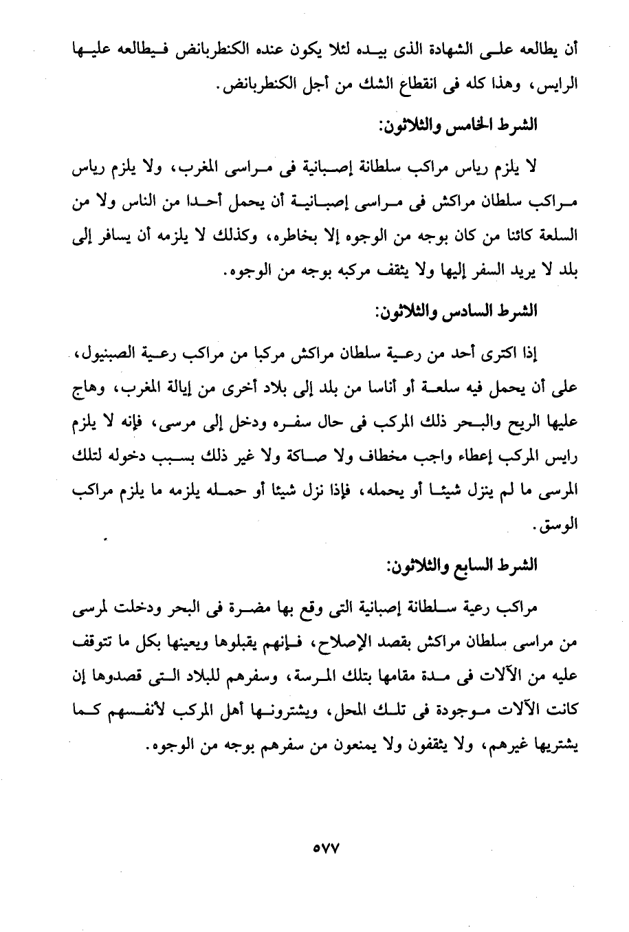 لا يلزم رياس مراكب سلطانة إصبانية في مراسى المغرب، ولا يلزم رياس مراكب سلطان مراكش في مراسى إصبانية أن يحمل أحدا من الناس ولا من السلعة كائنا من كان بوجه من الوجوه إلا بخاطره، وكذلك لا يلزمه أن يسافر إلى بلد لا يريد السفر إليها ولا يثقف مركبه بوجه من الوجوه.