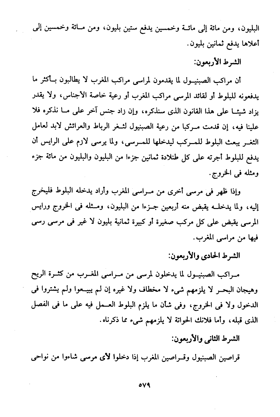 أن مراكب الصبنيول لما يقدمون لمراسى مراكب المغرب لا يطالبون بأكثر ما يدفعونه للبلوط أو لقائد المرسى مراكب المغرب أو رعية خاصة الأجناس، ولا يقدر يزاد شيئا على هذا القانون الذى سنذكره، وإن زاد جنس آخر على ما نذكره فلا علينا فيه، إن قدمت مركبا من رعية الصبنيول لثغر الرباط والعرائش لابد لعامل الثغر يبعث البلوط للمركب ليدخلها للمرسى، ولما يرسى لازم على الرايس أن يدفع للبلوط أجرته على كل طنلادة ثمانين جزءا من البليون والبليون من مائة جزء ومثله في الخروج.