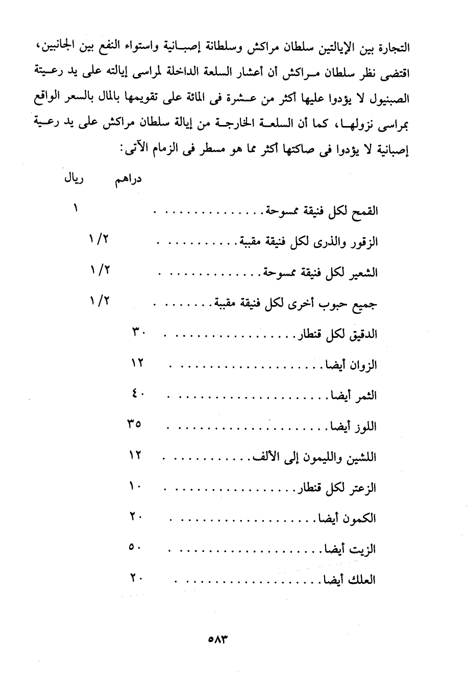 التجارة بين الإيالتين سلطان مراكش وسلطانة إصبانية واستواء النفع بين الجانبين، اقتضى نظر سلطان مراكش أن أعشار السلعة الداخلة لمراسى إيالته على يد رعيتة الصبنيول لا يؤدوا عليها أكثر من عشرة في المائة على تقويمها بالمال بالسعر الواقع بمراسى نزولها، كما أن السلعة الخارجة من إيالة سلطان مراكش على يد رعية إصبانية لا يؤدوا في صاكتها أكثر مما هو مسطر في الزمام الآتى:
