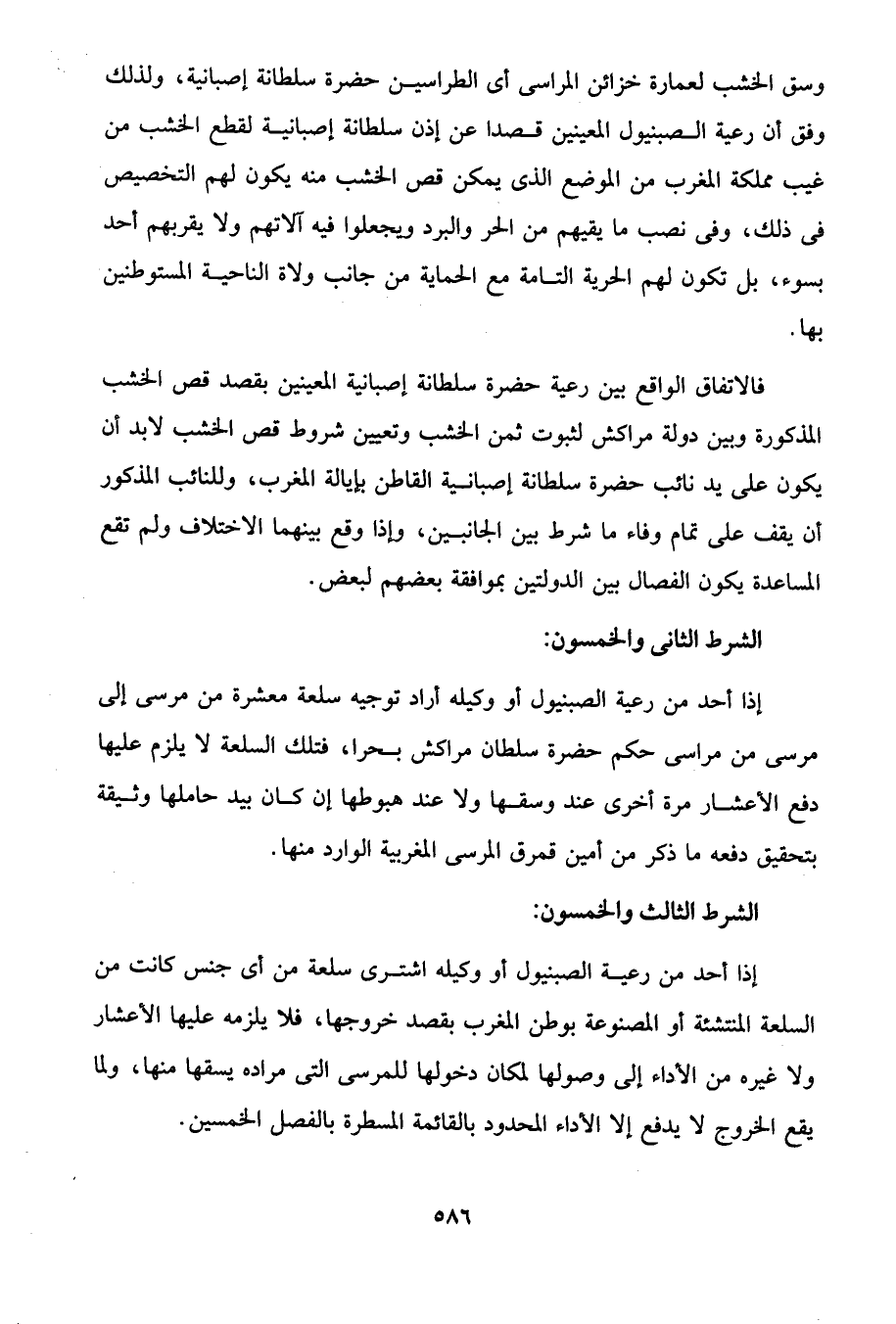 فالاتفاق الواقع بين رعية حضرة سلطانة إصبانية المعينين بقصد قص الخشب المذكورة وبين دولة مراكش لثبوت ثمن الخشب وتعيين شروط قص الخشب لابد أن يكون على يد نائب حضرة سلطانة إصبانية القاطن بإيالة المغرب، وللنائب المذكور أن يقف على تمام وفاء ما شرط بين الجانبين، وإذا وقع بينهما الاختلاف ولم تقع المساعدة يكون الفصال بين الدولتين بموافقة بعضهم لبعض.