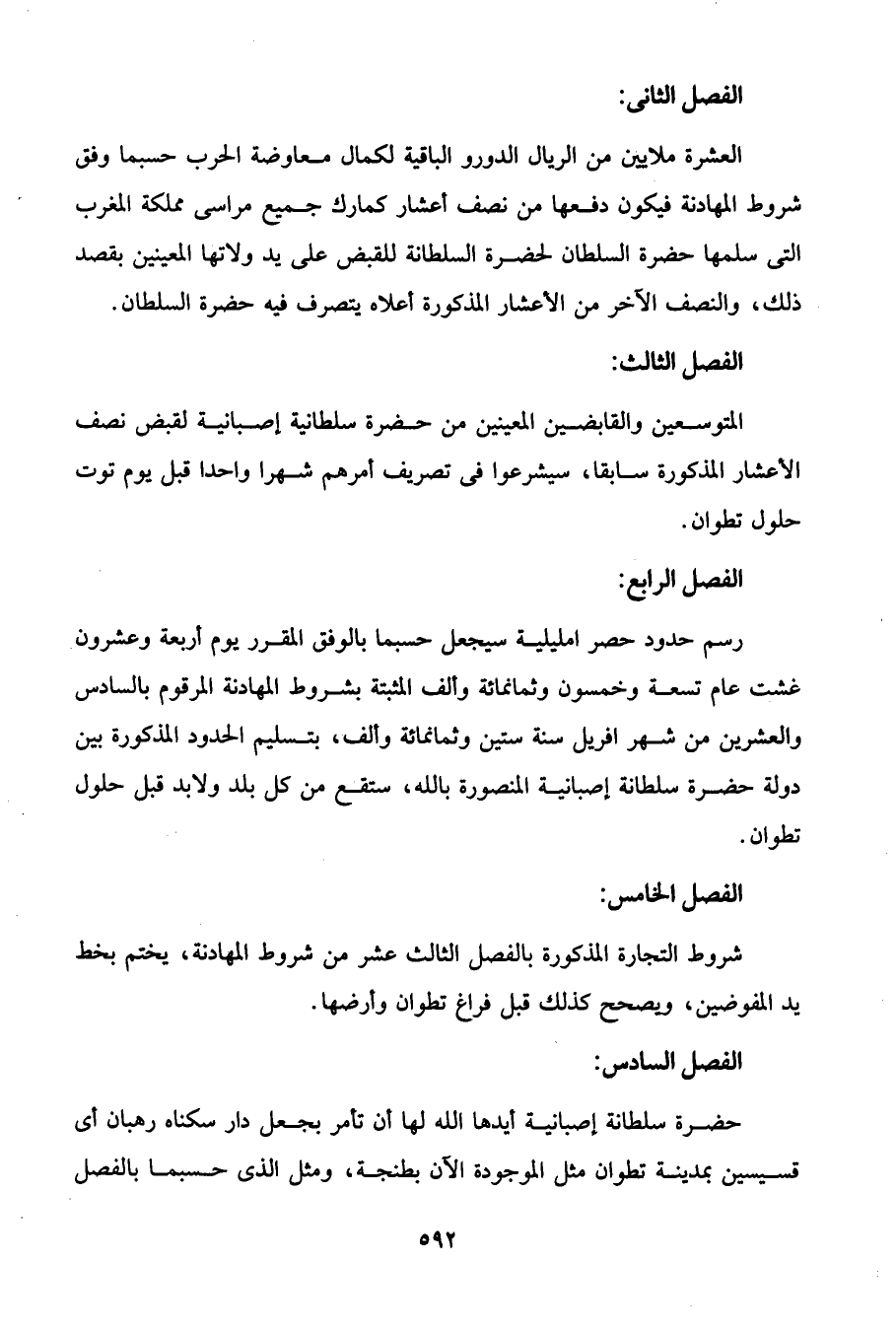 رسم حدود حصر امليلية سيجعل حسبما بالوفق المقرر يوم أربعة وعشرون غشت عام تسعة وخمسون وثمانمائة وألف المثبتة بشروط المهادنة المرقوم بالسادس والعشرين من شهر افريل سنة ستين وثمانمائة وألف، بتسليم الحدود المذكورة بين دولة حضرة سلطانة إصبانية المنصورة بالله، ستقع من كل بلد ولابد قبل حلول تطوان.